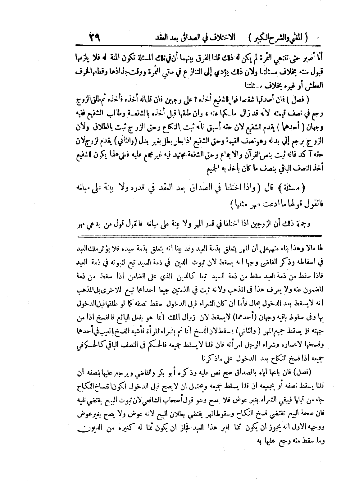 لها مالاً وهذا بناء منهم على أن المهر يتعلق بذمة العبد وقد بينا أنه يتعلق بذمة سيده فلا يؤثر ملك العبد في اسقاطه وذكر القاضي وجها أنه يسقط لان ثبوت الدين في ذمة السيد تبع لثبوته في ذمة العبد فإذا سقط من ذمة العبد سقط من ذمة السيد تبعاً كالدين الذي على الضامن إذا سقط من ذمة المضمون عنه ولا يعرف هذا في المذهب ولأنه ثبت في الذمتين جيعا احداهما تبع للاخرى بل المذهب أنه لا يسقط بعد الدخول حال فأما إن كان الشراء قبل الدخول سقط نصفه كما لو طلقها قبل الدخول بها وفي سقوط باقيه وجهان (أحدهما) لا يسقط لأن زوال الملك إنما هو بفعل البائع فالفسخ إذاً من جهته فلم يسقط جميع المهر (والثاني) يسقط لأن الفسخ إنما تم بشراء المرأة فأشبه الفسخ بالعيب في أحدهما وفسخها لاعساره وشراء الرجل امرأته فإن قلنا لا يسقط جميعه فالحكم في النصف الباقي كالحكم في جميعه إذا فسخ النكاح بعد الدخول على ما ذكرنا (فصل) فإن باعها إياه بالصداق صح نص عليه وذكره أبو بكر والقاضي ويرجع عليها بنصفه إن قلنا يسقط نصفه أو بجميعة إن قلنا يسقط جميعه ويحتمل أن لا يصح قبل الدخول لكون انفساخ النكاح جاء من قبلها فيبقى الشراء بغير عوض فلا يصح وهو قول أصحاب الشافعي لأن ثبوت البيع يقتضي نفيه فإن صحة البيع تقتضي فسخ النكاح وسقوط المهر يقتضي بطلان البيع لأنه عوض ولا يصح بغير عوض ووجهه الأول أنه يجوز أن يكون ثمناً لغير هذا العبد فجاز أن يكون ثمنا له كغيره من الديون وما سقط منه رجع عليها به