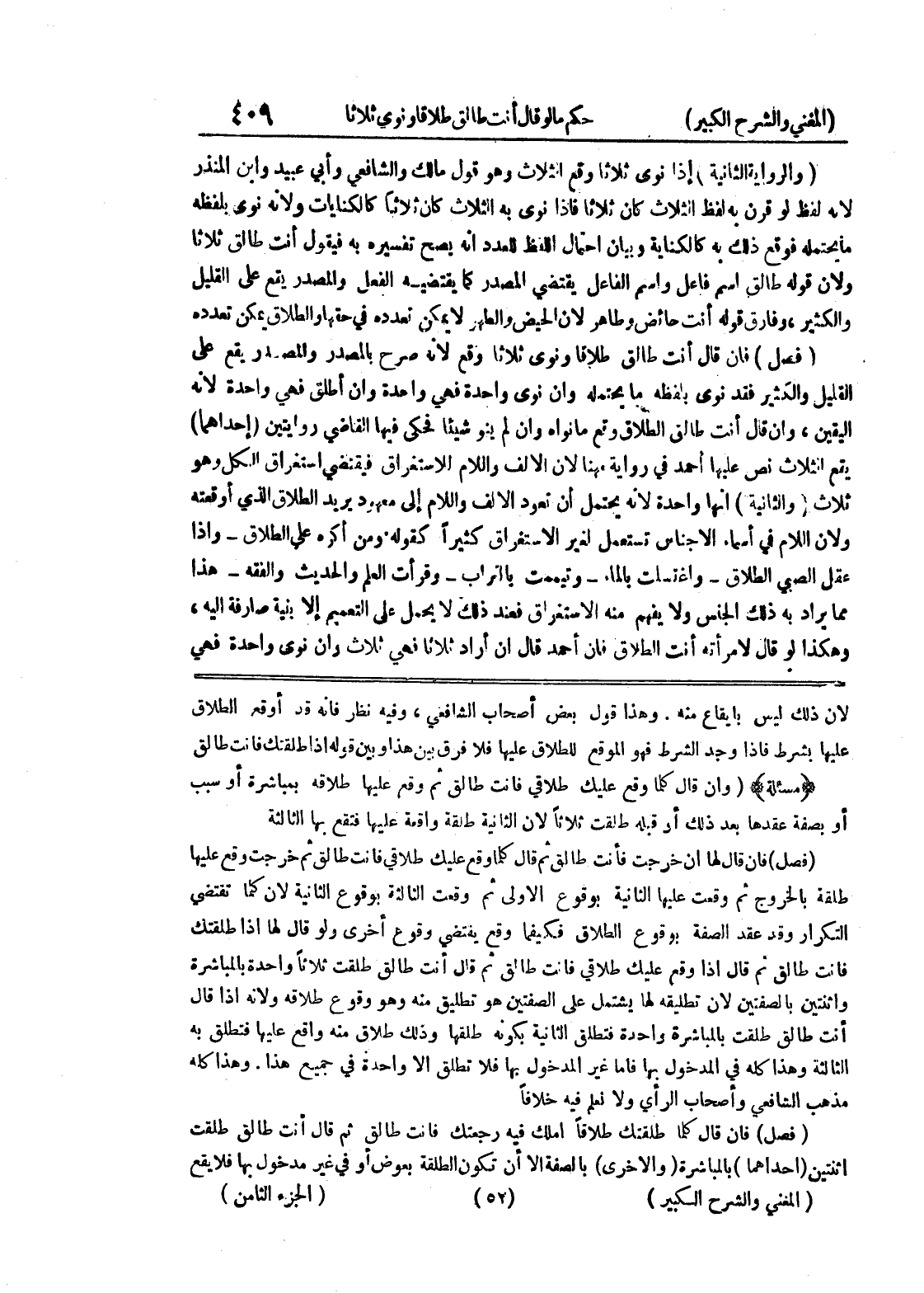 أو بصفة عقدها بعد ذلك أو قبله طلقت ثلاثاً لأن الثانية طلقة واقعة عليها فتقع بها الثالثة (فصل) فإن قال لها ان خرجت فأنت طالق ثم قال كلما وقع عليك طلاقي فأنت طالق ثم خرجت وقع عليها طلقة بالخروج ثم وقعت عليها الثانية بوقوع الاولى ثم وقعت الثالثة بوقوع الثانية لأن كلما تقتضي التكرار وقد عقد الصفة بوقوع الطلاق فكيفما وقع يقتضي وقوع أخرى ولو قال لها إذا طلقتك فأنت طالق ثم قال إذا وقع عليك طلاقي فأنت طالق ثم قال أنت طالق طلقت ثلاثاً واحدة بالمباشرة واثنتين بالصفتين لأن تطليقه لها يشتمل على الصفتين هو تطليق منه وهو وقوع طلاقه ولأنه إذا قال أنت طالق طلقت بالمباشرة واحدة فتطلق الثانية بكونه طلقها وذلك طلاق منه واقع عليها فتطلق به الثالثة وهذا كله في المدخول بها فأما غير المدخول بها فلا تطلق إلا واحدة في جميع هذا.