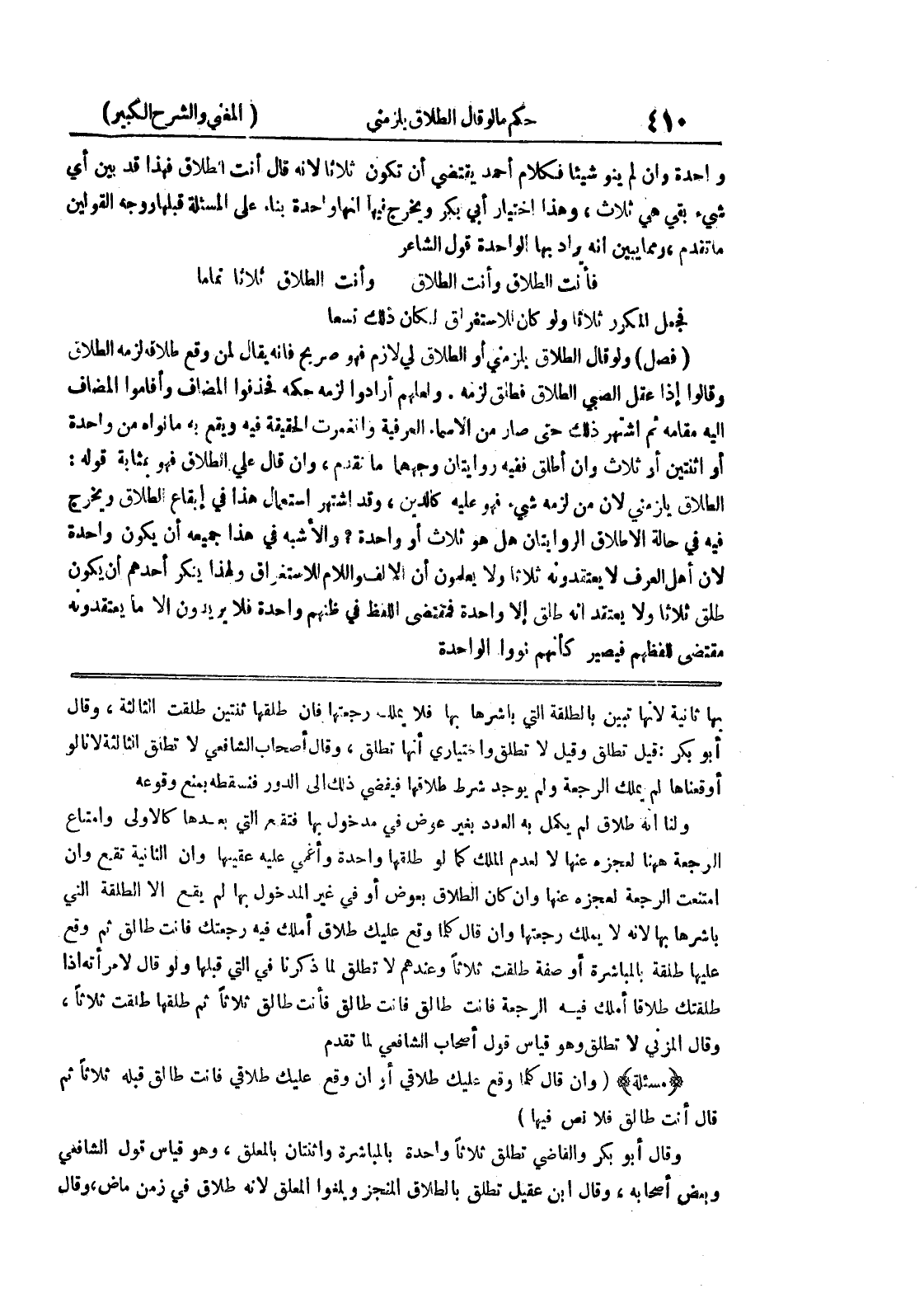 بها ثانية لأنها تبين بالطلقة التي باشرها بها فلا يملك رجعتها فإن طلقها ثنتين طلقت الثالثة، وقال أبو بكر: قيل تطلق وقيل لا تطلق واختياري أنها تطلق، وقال أصحاب الشافعي لا تطلق الثالثة لأنا لو أوقعناها لم يملك الرجعة ولم يوجد شرط طلاقها فيفضي ذلك الى الدور فنسقطه بمنع وقوعه ولنا أنه طلاق لم يكمل به العدد بغير عوض في مدخول بها فتقع التي بعدها كالأولى وامتناع الرجعة ههنا لعجزه عنها لا لعدم الملك كما لو طلقها واحدة وأغمى عليه عقيبها وأن الثانية تقع وإن امتنعت الرجعة لعجزه عنها وإن كان الطلاق بعوض أو في غير المدخول بها لم يقع إلا الطلقة التي باشرها بها لأنه لا يملك رجعتها وإن قال كلما وقع عليك طلاق أملك فيه رجعتك فأنت طالق ثم وقع عليها طلقة بالمباشرة أو صفة طلقت ثلاثاً وعندهم لا تطلق لما ذكرنا في التي قبلها ولو قال لامرأته إذا طلقتك طلاقاً أملك فيه الرجعة فأنت طالق فأنت طالق فأنت طالق ثلاثا ثم طلقها طلقت ثلاثاً، وقال المزني لا تطلق وهو قياس قول أصحاب الشافعي لما تقدم