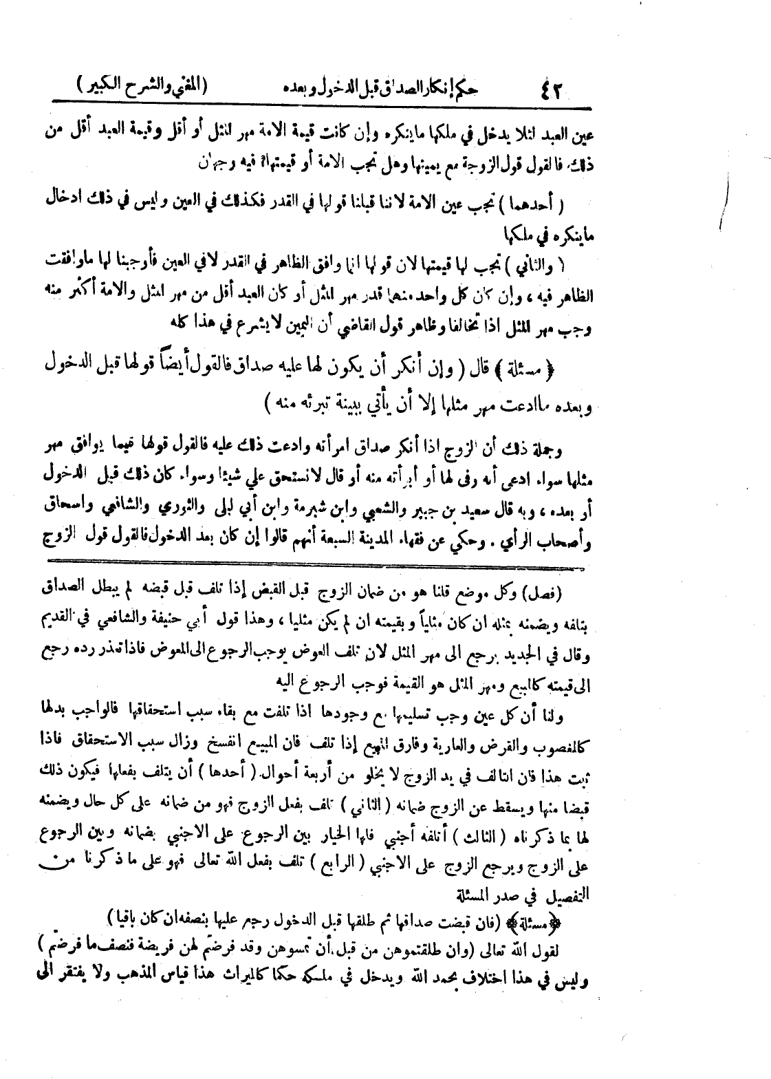 (فصل) وكل موضع قلنا هو من ضمان الزوج قبل القبض إذا تلف قبل قبضه لم يبطل الصداق بتلفه ويضمنه بمثله إن كان مثلياً وبقيمته إن لم يكن مثلياً، وهذا قول أبي حنيفة والشافعي في القديم وقال في الجديد يرجع إلى مهر المثل لأن تلف العوض يوجب الرجوع الى المعوض فإذا تعذر رده رجع إلى قيمته كالمبيع ومهر المثل هو القيمة فوجب الرجوع إليه ولنا أن كل عين وجب تسليمها مع وجودها إذا تلفت مع بقاء سبب إستحقاقها فالواجب بدلها كالمغصوب والقرض والعارية وفارق المبيع إذا تلف فإن المبيع انفسخ وزال سبب الاستحقاق فإذا ثبت هذا فإن التالف في يد الزوج لا يخلو من أربعة أحوال (أحدها) أن يتلف بفعلها فيكون ذلك قبضا منها ويسقط عن الزوج ضمانه (الثاني) تلف بفعل الزوج فهو من ضمانه على كل حال ويضمنه لها بما ذكرناه (الثالث) أتلفه أجنبي فلها الخيار بين الرجوع على الأجنبي بضمانه وبين الرجوع على الزوج ويرجع الزوج على الأجنبي (الرابع) تلف بفعل الله تعالى فهو على ما ذكرنا من التفصيل في صدر المسألة * (مسألة) * (فإن قبضت صداقها ثم طلقها قبل الدخول رجع عليها بنصفه إن كان باقيا) لقول الله تعالى (وإن طلقتموهن من قبل أن تمسوهن وقد فرضتم لهن فريضة فنصف ما فرضتم) وليس في هذا اختلاف بحمد الله ويدخل في ملكه حكماً كالميراث هذا قياس المذهب ولا يفتقر إلى