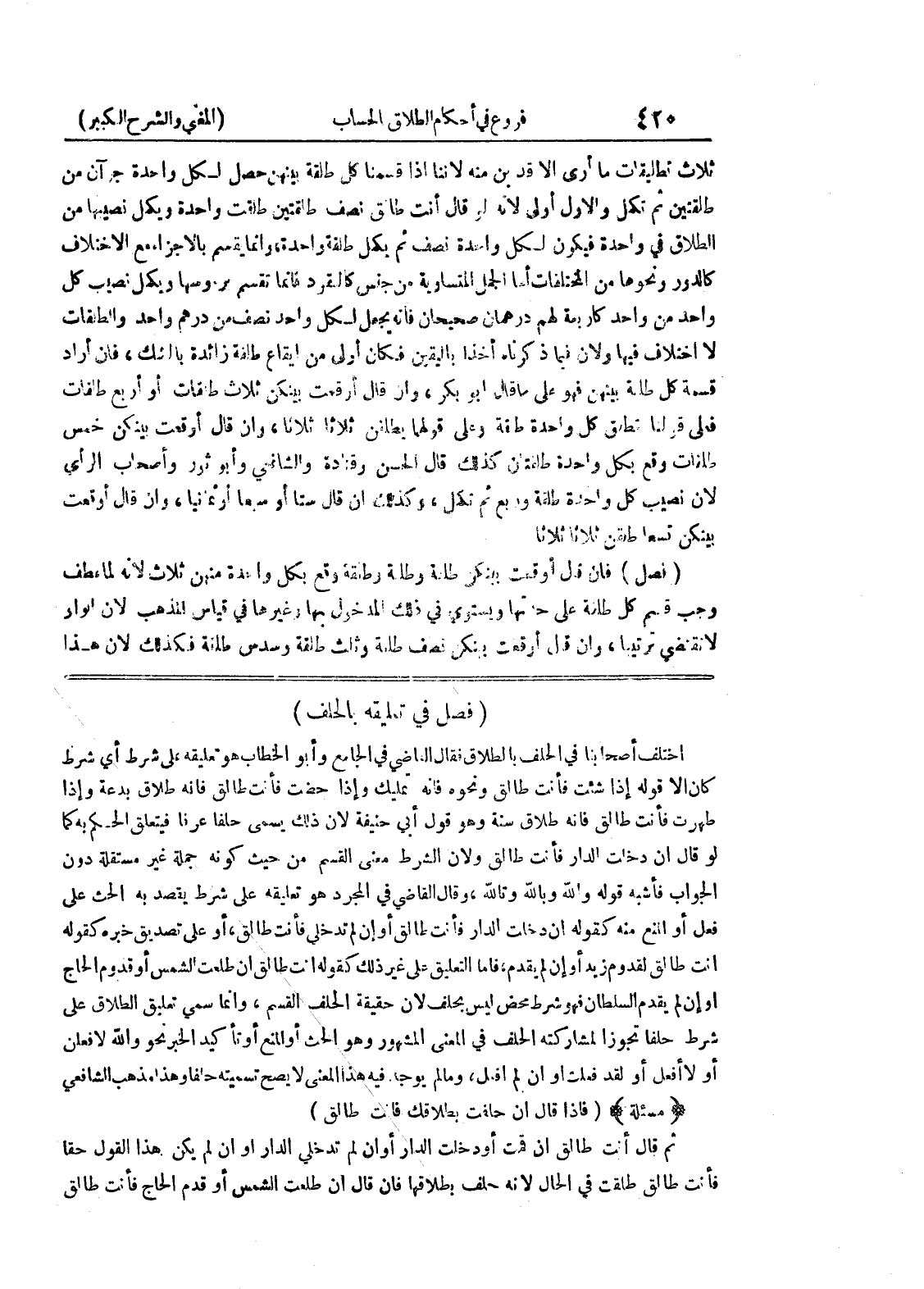 (فصل في تعليقه بالحلف) اختلف أصحابنا في الحلف بالطلاق فقال القاضي في الجامع وأبو الخطاب هو تعليقه على شرط أي شرط كان إلا قوله إذا شئت فأنت طالق ونحوه فإنه تمليك وإذا حضت فأنت طالق فإنه طلاق بدعة وإذا طهرت فأنت طالق فانه طلاق سنة وهو قول أبي حنيفة لأن ذلك يسمى حلفا عرفا فيتعلق الحكم به كما لو قال إن دخلت الدار فانت طالق ولأن الشرط معنى القسم من حيث كونه جملة غير مستقلة دون الجواب فأشبه قول والله وبالله وتالله، وقال القاضي في المجرد هو تعليقه على شرط يقصد به الحث على فعل أو المنع منه كقوله إن دخلت الدار فانت طالق أو إن لم تدخلي فأنت طالق، أو على تصديق خبره كقوله أنت طالق لقدوم زيد أو إن لم يقدم، فأما التعليق على غير ذلك كقوله أنت طالق إن طلعت الشمس أو قدوم الحاج أو إن لم يقدم السلطان فهو شرط محض ليس بحلف لأن حقيقة الحلف القسم، وإنما سمي تعليق الطلاق على شرط حلقا تجوزا المشاركته الحلف في المعنى المشهور وهو الحث أو المنع أو تأكيد الخبر نحو والله لا فعلن أو لا أفعل أو لقد فعلت أو إن لم أفعل، وما لم يوجه فيه هذا المعنى لا يصح تسميته حلفا وهذا مذهب الشافعي * (مسألة) * (فإذا قال ان حلفت بطلاقك فأنت طالق) ثم قال أنت طالق ان قمت أو دخلت الدار أن إن لم تدخلي الدار أو إن لم يكن هذا القول حقا فأنت طالق طلقت في الحال لأنه حلف بطلاقها فإن قال إن طلعت الشمس أو قدم الحاج فأنت طالق