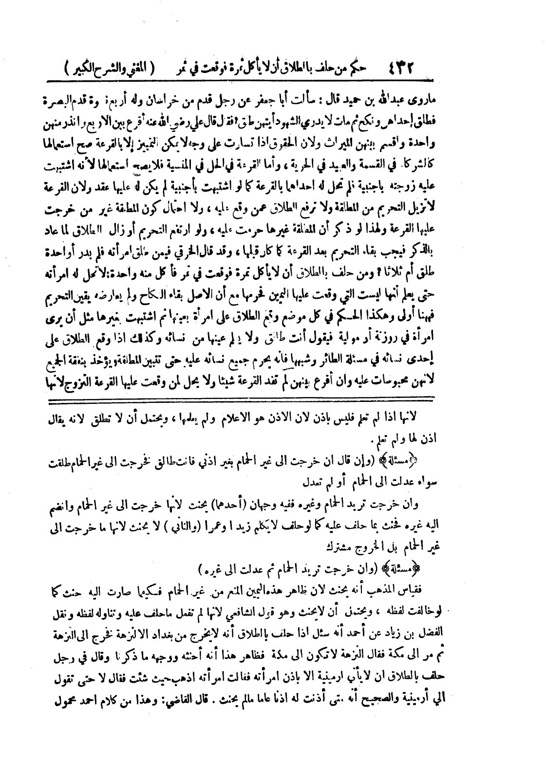 * (مسألة) * (وإن قال إن خرجت إلى غير الحمام بغير اذني فانت طالق فخرجت إلى غير الحمام طلقت سواء عدلت إلى الحمام أو لم تعدل وإن خرجت تريد الحمام وغيره ففيه وجهان (أحدهما) يحنت لأنها خرجت إلى غير الحمام وانضم إليه غيره فحنث بما حلف عليه كما لو حلف لا يكلم زيدا وعمرا (والثاني) لا يحنث لأنها ما خرجت إلى غير الحمام بل الخروج مشترك * (مسألة) * (وإن خرجت تريد الحمام ثم عدلت إلى غيره) فقياس المذهب أنه يحنث لأن ظاهر هذه اليمين المنع من غير الحمام فكيفما صارت إليه حنث كما لو خالفت لفظه، ويحتمل أن لا يحنث وهو قول الشافعي لأنها لم تفعل ما حلف عليه وتناوله لفظه ونقل الفضل بن زياد عن أحمد أنه سئل إذا حلف بالطلاق أنه لا يخرج من بغداد الا لنزهة فخرج إلى النزهة