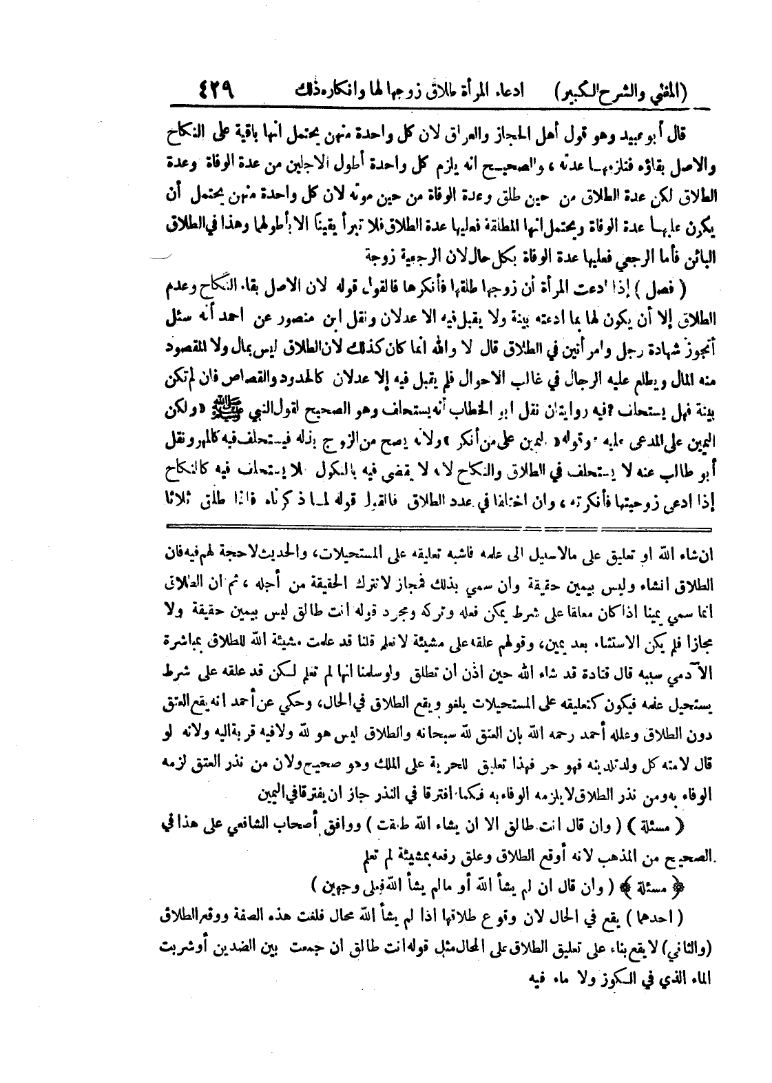 إن شاء الله أو تعليق على ما لا سبيل إلى علمه فأشبه تعليقه على المستحيلات، والحديث لا حجة لهم فيه فإن الطلاق انشاء وليس بيمين حقيقة وإن سمي بذلك فمجاز لا تترك الحقيقة من أجله، ثم ان الطلاق انما سمي يميناً إذا كان معلقا على شرط يمكن فعله وتركه ومجرد قوله أنت طالق ليس بيمين حقيقة ولا مجازا فلم يكن الاستثناء بعد يمين، وقولهم علقه على مشيئة لا نعلم قلنا قد علمت مشيئة الله للطلاق بمباشرة الآدمي سببه قال قتادة قد شاء الله حين أذن أن تطلق ولو سلمنا انها لم تعلم لكن قد علقه على شرط يستحيل علمه فيكون كتعليقه على المستحيلات يلغو ويقع الطلاق في الحال، وحكي عن أحمد أنه يقع العتق دون الطلاق وعلله أحمد رحمه الله بأن العتق لله سبحانه والطلاق ليس هو لله ولا فيه قربة إليه ولأنه لو قال لأمته كل ولد تلدينه فهو حر فهذا تعليق للحرية على الملك وهو صحيح ولأن من نذر العتق لزمه الوفاء به ومن نذر الطلاق لا يلزمه الوفاء به فكما افترقا في النذر جاز أن يفترقا في اليمين * (مسألة) * (وإن قال أنت طالق إلا أن يشاء الله طلقت) ووافق أصحاب الشافعي على هذا في الصحيح من المذهب لأنه أوقع الطلاق وعلق رفعه بمشيئة لم تعلم * (مسألة) * (وإن قال إن لم يشأ الله أو ما لم يشأ الله فعلى وجهين) (أحدهما) يقع في الحال لأن وقوع طلاقها إذا لم يشأ الله محال فلغت هذه الصفة ووقع الطلاق (والثاني) لا يقع بناء على تعليق الطلاق على المحال مثل قوله انت طلق ان جمعت بيبن الضدين أو شربت الماء الذي في الكوز ولا ماء فيه