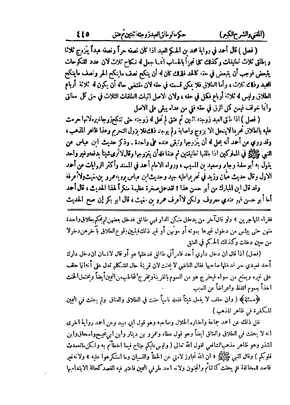 فقراء المهاجرين " ولو قال آخر من يدخل منكن الدار فهي طالق فدخل بعضهن لم يحكم بطلاق واحدة منهن حتى ييئس من دخول غيرها بموته أو موتهن أو غير ذلك فيتبين وقوع الطلاق بآخرهن دخولاً من حين دخلت وكذلك الحكم في العتق (فصل) إذا قال إن دخل داري أحد فامرأتي طالق فدخلها هو أو قال لإنسان إن دخل دارك أحد فعبدي حر فدخلها صاحبها فقال القاضي لا يحنث لا قرينة حال المتكلم تدل على أنه إنما حلف على غيره ويمنع من سواه فيخرج هو من العموم بالقرينة ويخرج المخاطب من اليمين أيضا ويحتمل الحنث أخذاً بعموم اللفظ وإعراضاً عن السبب * (مسألة) * (وإن حلف لا يفعل شيئاً ففعله ناسياً حنث في الطلاق والعتاق ولم يحنث في اليمين المكفرة في ظاهر المذهب) نقل ذلك عن أحمد جماعة واختاره الخلال وصاحبه وهو قول أبي عبيد وعن أحمد رواية أخرى أنه لا يحنث في الطلاق والعتاق أيضاً وهو قول عطاء وعمرو بن دينار وابن ابي نجيح وإسحاق وابن المنذر وهو ظاهر مذهب الشافعي لقول الله تعالى (وليس عليكم جناع فيما أخطأتم به ولكن ما تعمدت قلوبكم) وقال النبي صلى الله عليه وسلم " إن الله تجاوز لأمتي عن الخطأ والنسيان وما استكرهوا عليه " ولأنه غير قاصد للمخالفة فلم يحنث كالنائم والمجنون ولأنه أحد طرفي اليمين فاعتبر فيه القصد كحالة الابتداء بها