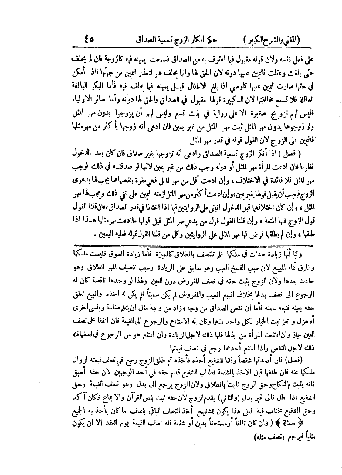 ولنا أنها زيادة حديث في ملكها فلم تتنصف بالطلاق كالمميزة فأما زيادة السوق فليست ملكها وفارق نماء المبيع لأن سبب الفسخ العيب وهو سابق على الزيادة وسبب تنصيف المهر الطلاق وهو حادث بعدها ولأن الزوج يثبت حقه في نصف المفروض دون العين ولهذا لو وجدها ناقصة كان له الرجوع الى نصف بدلها بخلاف المبيع المعيب والمفروض لم يكن سميناً فلم يكن له أخذه والمبيع تعلق حقه بعينه فتبعه سمنه فأما إن نقص الصداق من وجه وزاد من وجه مثل أن يتعلم صناعة وينسى أخرى أو هزل وتعلم ثبت الخيار لكل واحد منهما وكان له الامتناع والرجوع الى القيمة فإن اتفقا على نصف العين جاز وإن امتنعت المرأة من بذلها فلها ذلك لأجل الزيادة وان امتنع هو من الرجوع في نصفها فله ذلك لأجل النقص وإذا امتنع أحدهما رجع في نصف قيمتها (فصل) فإن أصدقها شقصاً وقلنا للشفيع أحذه فأخذه ثم طلق الزوج رجع في نصف قيمته لزوال ملكها عنه فإن طلقها قبل الأخذ بالشفعة فطالب الشفيع قدم حقه في أحد الوجهين لأن حقه أسبق فإنه يثبت بالنكاح وحق الزوج ثابت بالطلاق ولان الزوج يرجع الى بدل وهو نصف القيمة وحق الشفيع إذا بطل فإلى غير بدل (والثاني) يقدم الزوج لأن حقه ثبت بنص القرآن والإجماع فكان آكد وحق الشفيع مختلف فيه فعلى هذا يكون للشفيع أخذ النصف الباقي بنصف ما كان يأخذ به الجميع * (مسألة) * (وإن كان تالفاً أو مستحقاً بدين أو شفعة فله نصف القيمة يوم العقد إلا أن يكون