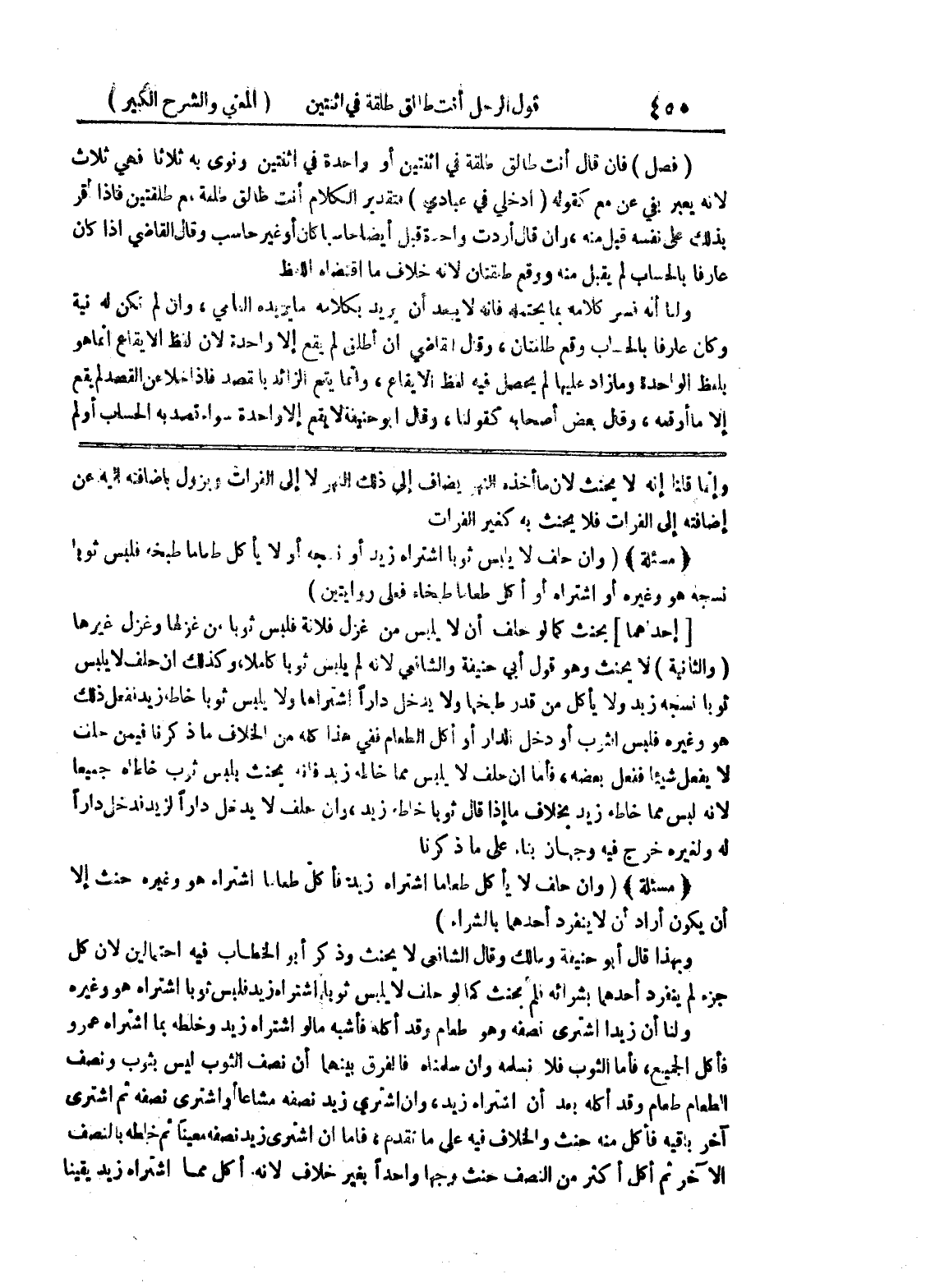 وإنما قلنا إنه لا يحنث لأن ما أخذه النهر يضاف إلى ذلك النهر لا إلى الفرات وبزول باضافته إليه عن إضافته إلى الفرات فلا يحنث به كغير الفرات * (مسألة) * (وإن حلف لا يلبس ثوبا اشتراه زيد أو نسجه أو لا يأكل طعاماً طبخه فلبس ثوباً نسجه هو وغيره أو اشتراه أو أكل طعاماً طبخاه فعلى روايتين) [إحداهما] يحنث كما لو حلف أن لا يلبس من غزل فلانة فلبس ثوبا من غزلها وغزل غيرها (والثانية) لا يحنث وهو قول أبي حنيفة والشافعي لأنه لم يلبس ثوباً كاملاً، وكذلك إن حلف لا يلبس ثوبا نسجه زيد ولا يأكل من قدر طبخها ولا يدخل داراً اشتراها ولا يلبس ثوباً خاطه زيد ففعل ذلك