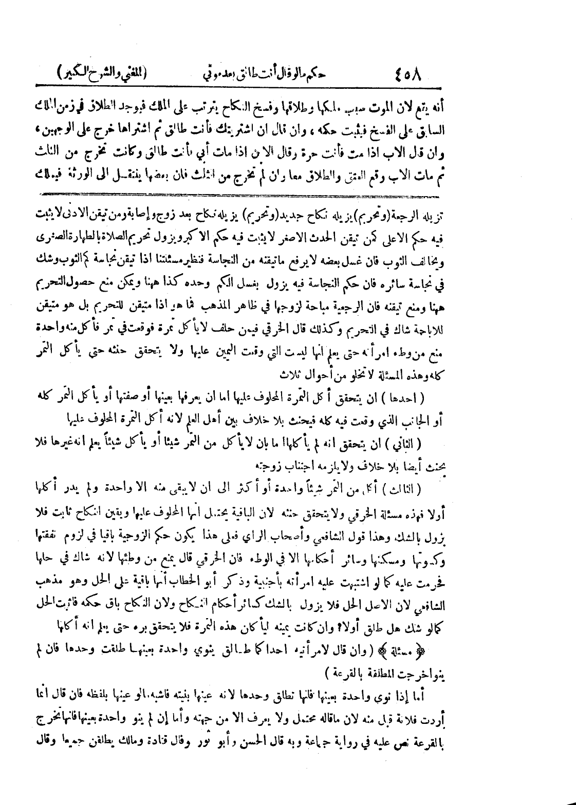 تزيله الرجعة (وتحريم) يزيله نكاح جديد (وتحريم) يزيله نكاح بعد زوج وإصابة ومن تيقن الأدنى لا يثبت فيه حكم الأعلى كمن تيقن الحدث الأصغر لا يثبت فيه حكم الأكبر ويزول تحريم الصلاة بالطهارة الصغرى ويخالف الثوب فإن غسل بعضه لا يرفع ما تيقنه من النجاسة فنظير مسئلتنا إذا تيقن نجاسة كم الثوب وشك في نجاسة سائره فإن حكم النجاسة فيه يزول بغسل الكم وحده كذا ههنا ويمكن منع حصول التحريم ههنا ومنع تيقنه فإن الرجعية مباحة لزوجها في ظاهر المذهب فما هو إذا متيقن للتحريم بل هو متيقن للاباحة شاك في التحريم وكذلك قال الخرقي فيمن حلف لا يأكل تمرة فوقعت في تمر فأكل منه واحدة منع من وطئ امرأته حتى يعلم أنها ليست التي وقعت اليمين عليها ولا يتحقق حنثه حتى يأكل التمر كله وهذه المسألة لا تخلو من أحوال ثلاث (أحدها) أن يتحقق أكل التمرة المحلوف عليها إما أن يعرفها بعينها أو صفتها أو يأكل التمر كله أو الجانب الذي وقعت فيه كله فيحنث بلا خلاف بين أهل العلم لأنه أكل التمرة المحلوف عليها (الثاني) ان يتحقق أنه لم يأكلها أما بأن لا يأكل من التمر شيئاً أو يأكل شيئاً يعلم أنه غيرها فلا يحنث أيضاً بلا خلاف ولا يلزمه اجتناب زوجته (الثالث) أكل من التمر شيئاً واحدة أو أكثر الى أن لا يبقى منه إلا واحدة ولم يدر أكلها