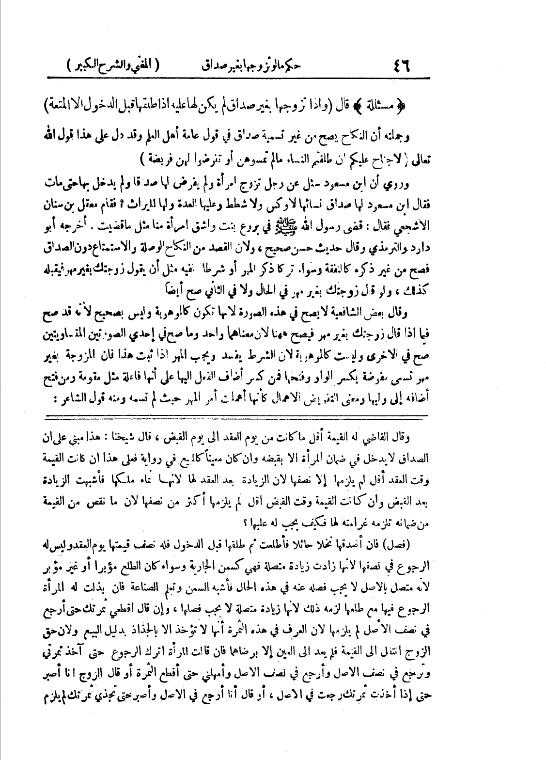 وقال القاضي له القيمة أقل ما كانت من يوم العقد الى يوم القبض، قال شيخنا: هذا مبني على أن الصداق لا يدخل في ضمان المرأة إلا بقبضه وإن كان معيناً كالمبيع في رواية فعلى هذا إن كانت القيمة وقت العقد أقل لم يلزمها إلا نصفها لأن الزيادة بعد العقد لها لأنها نماء ملكها فأشبهت الزيادة بعد القبض وإن كانت القيمة وقت القبض أقل لم يلزمها أكثر من نصفها لأن ما نقص من القيمة من ضمانه تلزمه غرامته لها فكيف يجب له عليها؟ (فصل) فإن أصدقها نخلا حائلاً فأطلعت ثم طلقها قبل الدخول فله نصف قيمتها يوم العقد وليس له الرجوع في نصفها لانها زادت زيادة متصلة فهي كسمن الجارية وسواء كان الطلع مؤبراً أو غير مؤبر لأنه متصل بالأصل لا يجب فصله عنه في هذه الحال فأشبه السمن وتعلم الصناعة فإن بذلت له المرأة الرجوع فيها مع طلعها لزمه ذلك لأنها زيادة متصلة لا يجب فصلها، وإن قال اقطعي ثمرتك حتى أرجع في نصف الأصل لم يلزمها لأن العرف في هذه الثمرة أنها لا تؤخذ إلا بالجذاذ بدليل البيع ولأن حق الزوج انتقل الى القيمة فلم يعد الى العين إلا برضاهما فإن قالت المرأة اترك الرجوع حتى آخذ ثمرتي وترجع في نصف الأصل وأرجع في نصف الأصل وأمهلني حتى أقطع الثمرة أو قال الزوج أنا أصبر حتى إذا أخذت ثمرتك رجعت في الأصل، أو قال أنا أرجع في الأصل وأصبر حتى تجذي ثمرتك لم يلزم