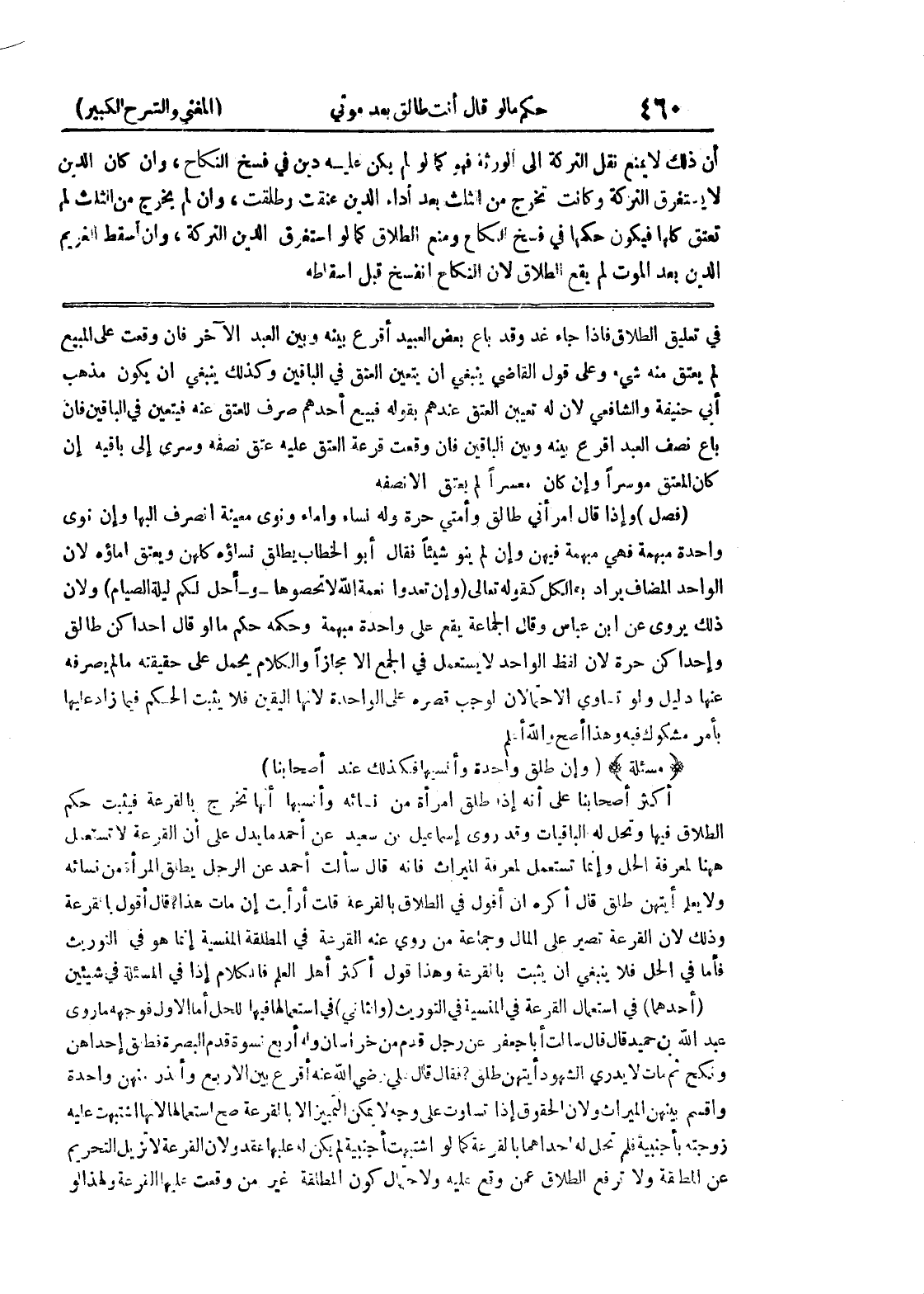 في تعليق الطلاق فإذا جاء غد وقد باع بعض العبيد أقرع بينه وبين العبد الآخر فإن وقعت على المبيع لم يعتق منه شئ وعلى قول القاضي ينبغي أن يتعين العتق في الباقين وكذلك ينبغي أن يكون مذهب أبي حنيفة والشافعي لأن له تعيين العتق عندهم بقوله فبيع أحدهم صرف للعتق عنه فيتعين في الباقين فإن باع نصف العبد أقرع بينه وبين الباقين فإن وقعت قرعة العتق عليه عتق نصفه وسرى إلى باقيه إن كان المعتق موسراً وإن كان معسراً لم يعتق إلا نصفه (فصل) وإذا قال امرأتي طالق وأمتي حرة وله نساء وإماء ونوى معينة انصرف إليها وإن نوى واحدة مبهمة فهي مبهمة فيهن وإن لم ينو شيئاً فقال أبو الخطاب يطلق نساؤه كلهن ويعتق إماؤه لأن الواحد المضاف يراد به الكل كقوله تعالى (وإن تعدوا نعمة الله لا تحصوها - و - أحل لكم ليلة الصيام) ولأن