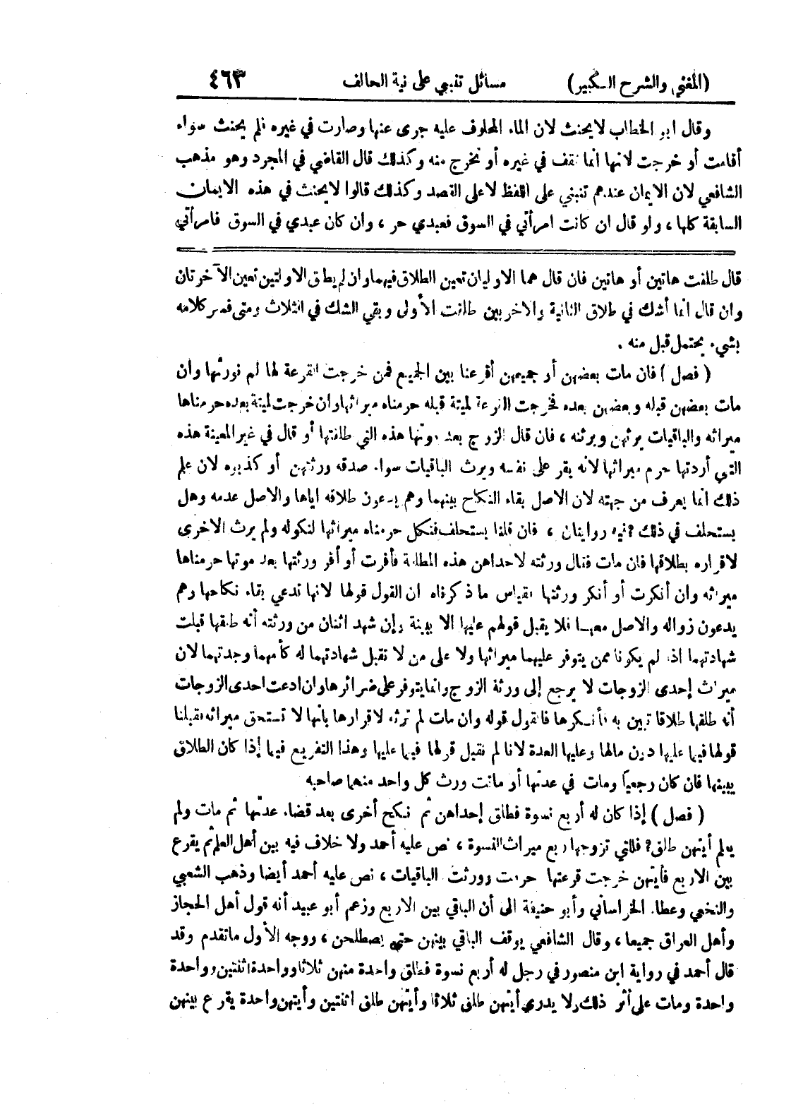 (فصل) فإن مات بعضهن أو جميعهن أقرعنا بين الجميع خرجت القرعة لها لم نورثها وإن مات بعضهن قبله وبعضهن بعده فخرجت القرعة لميتة قبله حرمناه ميراثها وإن خرجت لميتة بعده حرمناها ميراثه والباقيات يرثهن ويرثنه، فإن قال الزوج بعد موتها هذه التي طلقتها أو قال في غير المعينة هذه التي أردتها حرم ميراثها لأنه يقر على نفسه ويرث الباقيات سواء صدقه ورثتهن أو كذبوه لان علم ذلك إنما يعرف من جهته لأن الأصل بقاء النكاح بينهما وهم يدعون طلاقه إياها والأصل عدمه وهل يستحلف في ذلك؟ فيه روايتان، فإن قلنا يستحلف فنكل حرمناه ميراثها لنكوله ولم يرث الأخرى لاقراره بطلاقها فإن مات فقال ورثته لاحداهن هذه المطلقة فأقرت أو أقر ورثتها بعد موتها حرمناها ميراثه وإن أنكرت أو أنكر ورثتها بقياس ما ذكرناه إن القول قولها لأنها تدعي بقاء نكاحها وهم يدعون زواله والاصل معها فلا يقبل قولهم عليها إلا ببينة وإن شهد اثنان من ورثته أنه طلقها قبلت شهادتهما إذا لم يكونا ممن يتوفر عليهما ميراثها ولا على من لا تقبل شهادتهم له كأمهما وجدتهما لان ميراث إحدى الزوجات لا يرجع إلى ورثة الزوج وإنما يتوفر على ضرائرها وإن ادعت إحدى الزوجات أنه طلقها طلاقاً تبين به فأنكرها فالقول قوله وإن مات لم ترثه لإقرارها بانها لا تستحق ميراثه فقبلنا قولها فيما عليها دون مالها وعليها العدة لأنا لم نقبل قولها فيما عليهما وهذا التفريع فيما إذا كان الطلاق يبينها فإن كان رجعياً ومات في عدتها أو ماتت ورث كل واحد منهما صاحبه (فصل) إذا كان له أربع نسوة فطلق إحداهن ثم نكح أخرى بعد قضاء عدتها ثم مات ولم يعلم أيتهن طلق؟ فللتي تزوجها ربع ميراث النسوة، نص عليه أحمد ولا خلاف فيه بين أهل العلم ثم يقرع بين الأربع فأيتهن خرجت قرعتها حرمت وورثت الباقيات، نص عليه أحمد أيضاً وذهب الشعبي والنخعي وعطاء الخراساني وأبو حنيفة إلى أن الباقي بين الأربع وزعم أبو عبيد أنه قول أهل الحجاز