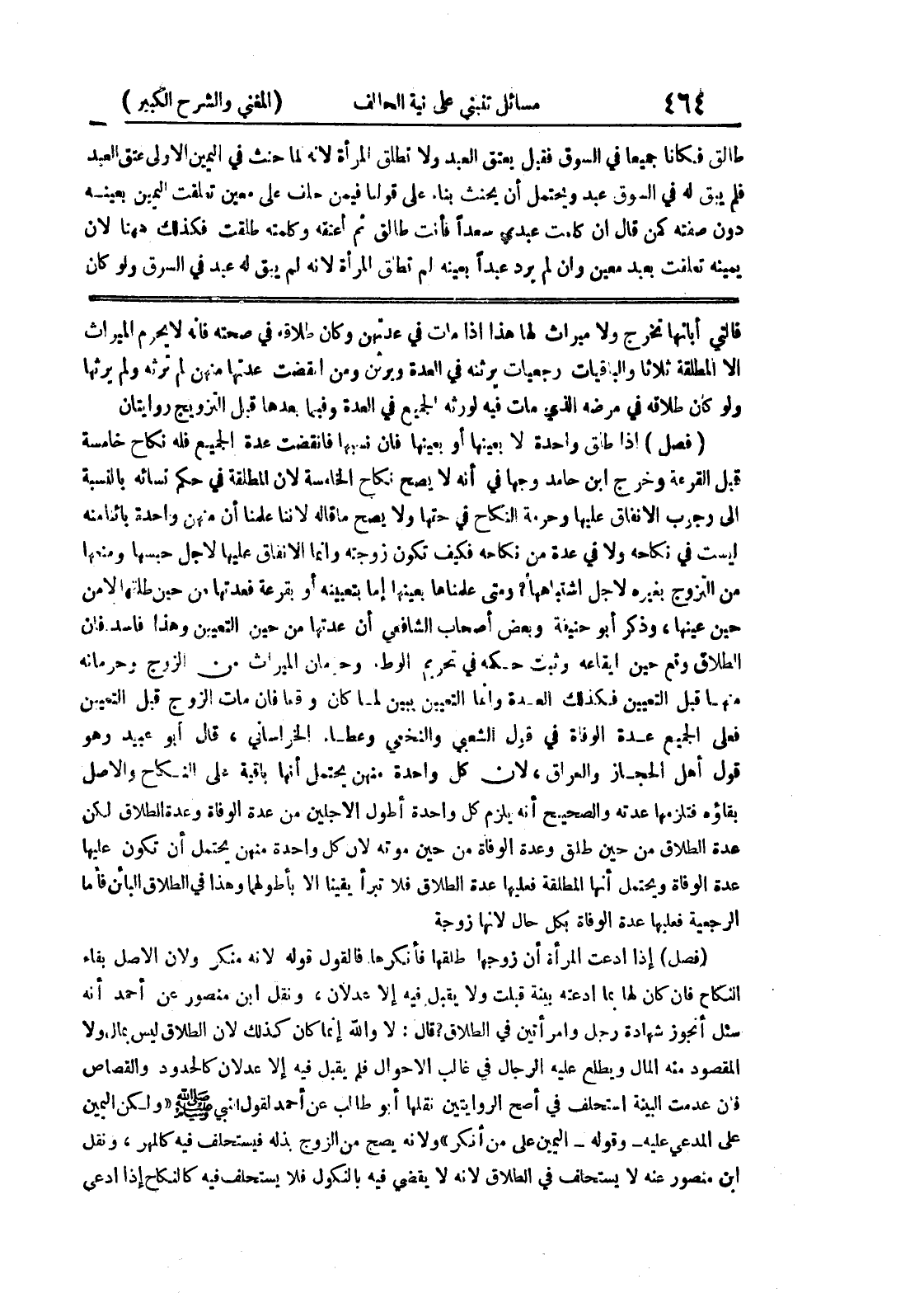 فالتي أبانها تخرج ولا ميراث لها هذا إذا مات في عدتهن وكان طلاقه في صحته فإنه لا يحرم الميراث إلا المطلقة ثلاثاً والباقيات رجعيات يرثنه في العدة ويرثن ومن انقضت عدتها منهن لم ترثه ولم يرثها ولو كان طلاقه في مرضه الذي مات فيه لورثه الجميع في العدة وفيما بعدها قبل التزويج روايتان (فصل) إذا طلق واحدة لا بعينها أو بعينها فان نسبها فانقضت عدة الجميع فله نكاح خامسة قبل القرعة وخرج ابن حامد وجهاً في أنه لا يصح نكاح الخامسة لأن المطلقة في حكم نسائه بالنسبة إلى وجوب الانفاق عليها وحرمة النكاح في حقها ولا يصح ما قاله لاننا علمنا أن منهن واحدة بائنا منه ليس في نكاحه ولا في عدة من نكاحه فكيف تكون زوجته وإنما الانفاق عليها لأجل حبسها ومنعها من التزوج بغيره لأجل اشتباهها؟ ومتى علمنا بعينها إما بتعيينه أو بقرعة فعدتها من حين طلقها لا من حين عينها، وذكر أبو حنيفة وبعض أصحاب الشافعي أن عدتها من حين التعيين وهذا فاسد فإن الطلاق وقع حين إيقاعه وثبت حكمه في تحريم الوطئ وحرمان الميراث من الزوج وحرمانه منها قبل التعيين فكذلك العدة وإنما التعيين يبين لما كان وقعا فإن مات الزوج قبل التعيين فعلى الجميع عدة الوفاة في قول الشعبي والنخعي وعطاء الخراساني، قال أبو عبيد وهو قول أهل الحجاز والعراق، لأن كل واحدة منهن يحتمل أنها باقية على النكاح والأصل بقاؤه فتلزمها عدته والصحيح أنه يلزم كل واحدة أطول الأجلين من عدة الوفاة وعدة الطلاق لكن عدة الطلاق من حين طلق وعدة الوفاة من حين موته لأن كل واحدة منهن يحتمل أن تكون عليها عدة الوفاة ويحتمل أنها المطلقة فعليها عدة الطلاق فلا تبرأ يقينا إلا بأطولهما وهذا في الطلاق البائن فأما الرجعية فعليها عدة الوفاة بكل حال لأنها زوجة (فصل) إذا ادعت المرأة أن زوجها طلقها فأنكرها فالقول قوله لأنه منكر ولان الأصل بقاء