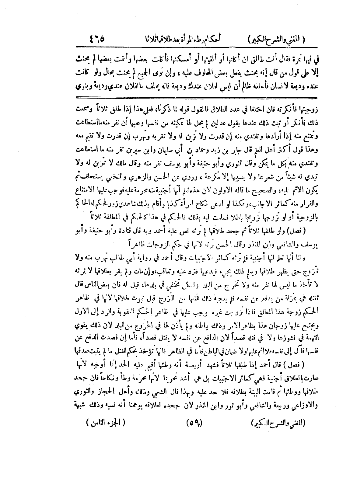 الحكم زوجة هذا المطلق فإذا تزوجت غيره وجب عليها في ظاهر الحكم العقوبة والرد إلى الأول ويجتمع عليها زوجان هذا بظاهر الأمر وذلك بباطنه ولم يأذن لها في الخروج من البلد لأن ذلك يقوي التهمة في نشوزها ولا في قتله قصداً لأن الدافع عن نفسه لا يقتل قصداً، فأما إن قصدت الدفع عن نفسها فآل إلى نفسه فلا أثم عليها ولا ضمان في الباطن فأما في الظاهر فإنها تؤخذ بحكم القتل ما لم يثبت صدقها (فصل) قال أحمد إذا طلقها ثلاثاً فشهد أربعة أنها وطئها أقيم عليه الحد إنما أوجبه لأنها صارت بالطلاق أجنبية فهي كسائر الأجنبيات بل هي أشد تحريماً لأنها محرمة وطأ ونكاحاً فان جحد طلاقها ووطئها ثم قامت البينة بطلاقه فلا حد عليه وبهذا قال الشعبي ومالك وأهل الحجاز والثوري والاوزاعي وربيعة والشافعي وأبو ثور وابن المنذر لأن جحده لطلاقه يوهمنا أنه نسيه وذلك شبهة