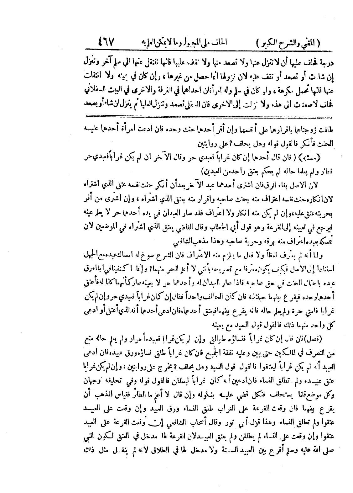 أحدهما وحده فيقرع بينهما حينئذ، فإن كان الحالف واحداً فقال إن كان غراباً فعبدي حر وإن لم يكن غراباً فأمتي حرة ولم يعلم حاله فإنه يقرع بينهما فيعتق أحدهما، فإن ادعى أحدهما أنه الذي أعتق أو إدعى كل واحد منهما ذلك فالقول قول السيد مع يمينه (فصل) فإن قال إن كان غراباً فنساؤه طوالق وإن لم يكن غراباً فعبيده أحرار ولم يعلم حاله منه من التصرف في الملكين حتى يبين وعليه نفقة الجميع فإن كان غراباً طلق نساؤه ورق عبيده فإن ادعى العبيد أنه لم يكن غراباً ليعتقوا فالقول قول السيد وهل يحلف؟ يخرج على روايتين، وإن لم يكن غراباً عتق عبيده ولم تطلق النساء فإن ادعين أنه كان غراباً ليطلقن فالقول قوله وفي تحليفه وجهان وكل موضع قلنا يستحلف فنكل قضي عليه بنكوله وإن قال لا أعلم ما الطائر فقياس المذهب أن يقرع بينهما فإن وقعت القرعة على الغراب طلق النساء ورق العبيد وإن وقعت على العبيد عتقوا ولم تطلق النساء وهذا قول أبي ثور وقال أصحاب الشافعي إن وقعت القرعة على العبيد عتقوا وإن وقعت على النساء لم يطلقن ولم يعتق العبيد لأن القرعة لها مدخل في العتق لكون النبي صلى الله عليه وسلم أقرع بين العبيد الستة ولا مدخل لها في الطلاق لأنه لم ينقل مثل ذلك