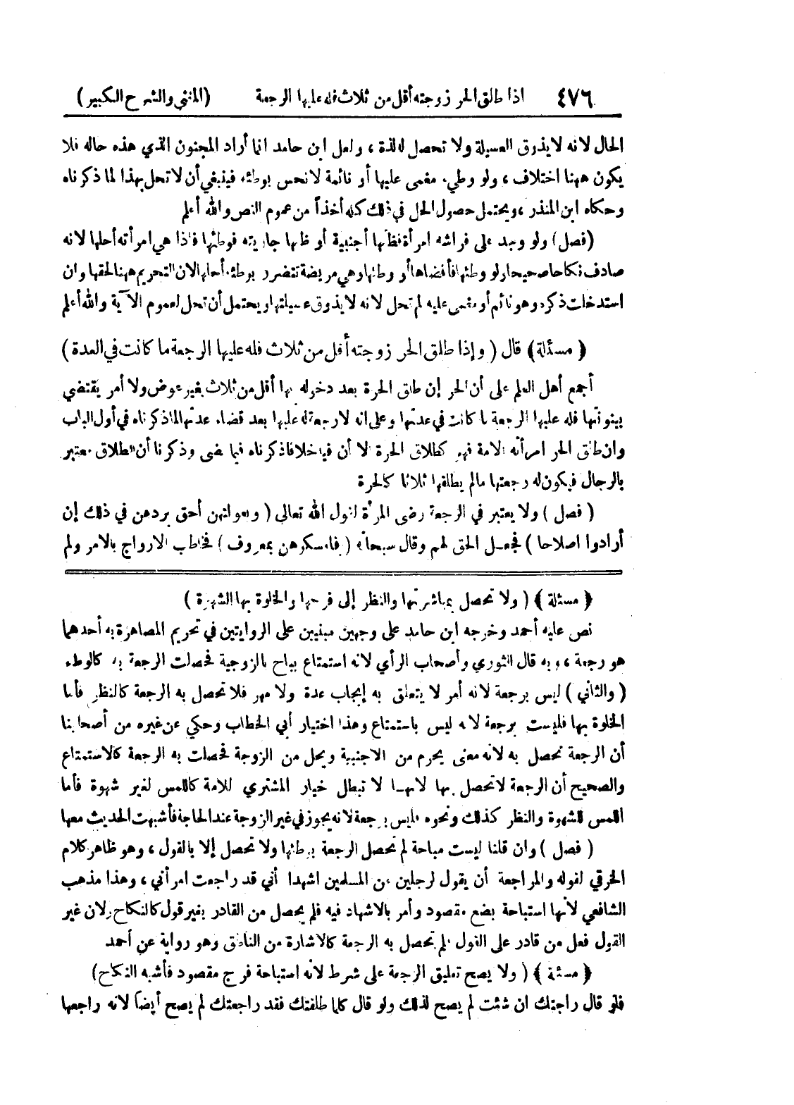 نص عليه أحمد وخرجه ابن حامد على وجهين مبنيين على الروايتين في تحريم المصاهرة به أحدهما هو رجعة، وبه قال الثوري وأصحاب الرأي لأنه استمتاع يباح بالزوجية فحصلت الرجعة به كالوطئ (والثاني) ليس برجعة لانه أمر لا يتعلق به إيجاب عدة ولا مهر فلا تحصل به الرجعة كالنظر فأما الخلوة بها فليست برجعة لأنه ليس باستمتاع وهذا اختيار أبي الخطاب وحكي عن غيره من أصحابنا أن الرجعة تحصل به لأنه معنى يحرم من الأجنبية ويحل من الزوجة فحصلت به الرجعة كالاستمتاع والصحيح أن الرجعة لا تحصل بها لأنها لا تبطل خيار المشتري للأمة كاللمس لغير شهوة فأما اللمس للشهوة والنظر كذلك ونحوه فليس برجعة لأنه يجوز في غير الزوجة عند الحاجة فأشبهت الحديث معها (فصل) وإن قلنا ليست مباحة لم تحصل الرجعة بوطئها ولا تحصل إلا بالقول، وهذا مذهب الخرقي لقوله والمراجعة أن يقول لرجلين من المسلمين اشهدا أني قد راجعت امرأتي، وهذا مذهب الشافعي لأنها استباحة بضع مقصود وأمر بالإشهاد فيه فلم يحصل من القادر بغير قول كالنكاح ولأن غير القول فعل من قادر على القول فلم تحصل به الرجعة كالإشارة من الناطق وهو رواية عن احمد * (مسألة) * (ولا يصح تعليق الرجعة على شرط لأنه استباحة فرج مقصود فأشبه النكاح) فلو قال راجتك إن شئت لم يصح لذلك ولو قال كلما طلقتك فقد راجعتك لم يصح أيضاً لأنه راجعها