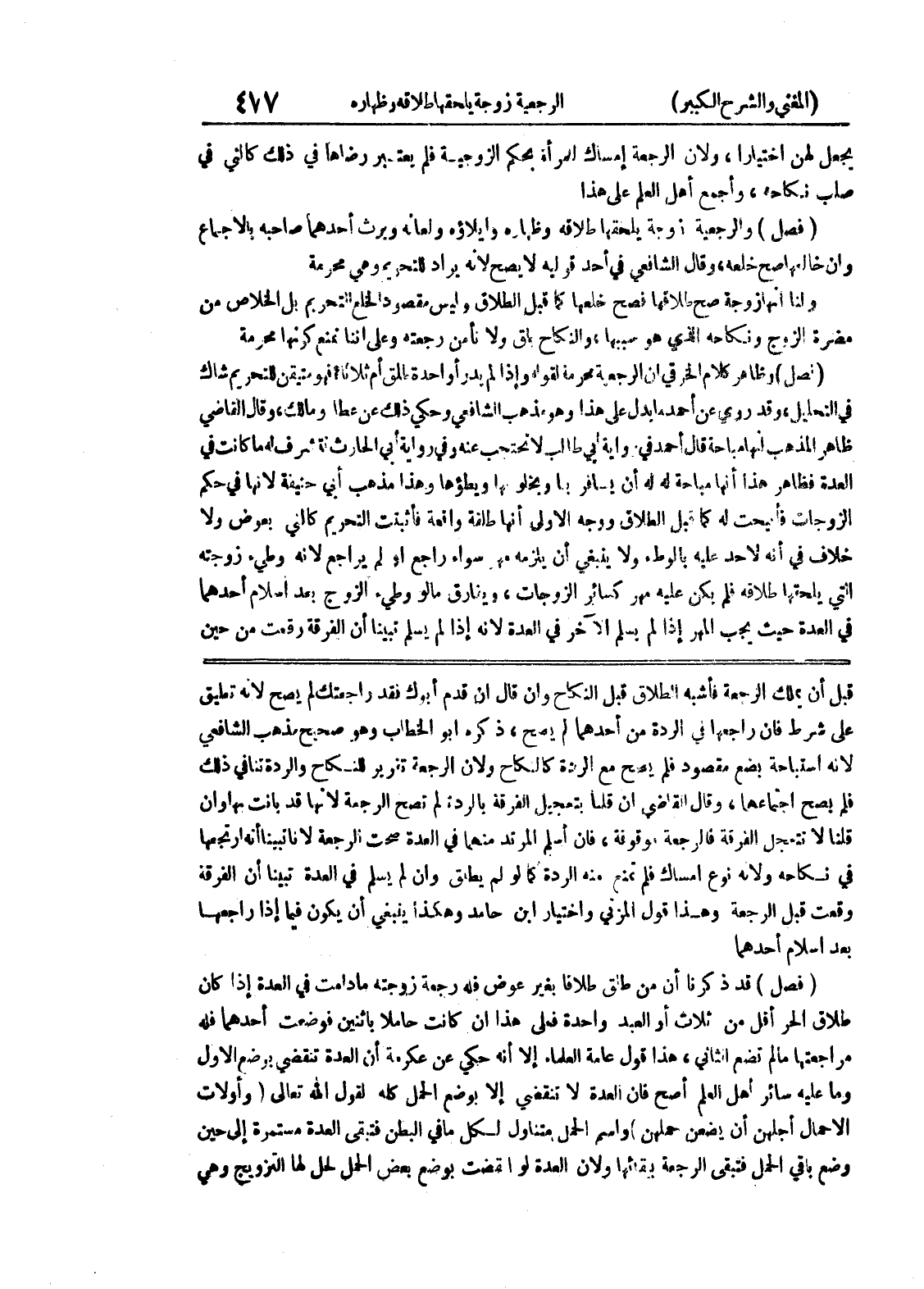 قبل أن يملك الرجعة فأشبه الطلاق قبل النكاح وإن قال إن قدم أبوك فقد راجعتك لم يصح لأنه تعليق على شرط فإن راجعها في الردة من أحدهما لم يصح، ذكره أبو الخطاب وهو صحيح مذهب الشافعي لأنه استباحة بضع مقصود فلم يصح مع الردة كالنكاح ولأن الرجعة تفرير للنكاح والردة تنافي ذلك فلم يصح اجتماعهما، وقال القاضي إن قلنا بتعجيل الفرقة بالردة لم تصح الرجعة لأنها قد بانت بها وإن قلنا لا تتعجل الفرقة فالرجعة موقوفة، فان أسلم المرتد منهما في العدة صحت الرجعة لأنا تبينا أنه ارتجعها في نكاحه ولأنه نوع إمساك فلم تمنع منه الردة كما لو لم يطلق وإن لم يسلم في العدة تبينا أن الفرقة وقعت قبل الرجعة وهذا قول المزني واختيار ابن حامد وهكذا ينبغي أن يكون فيما إذا راجعها بعد إسلام أحدهما