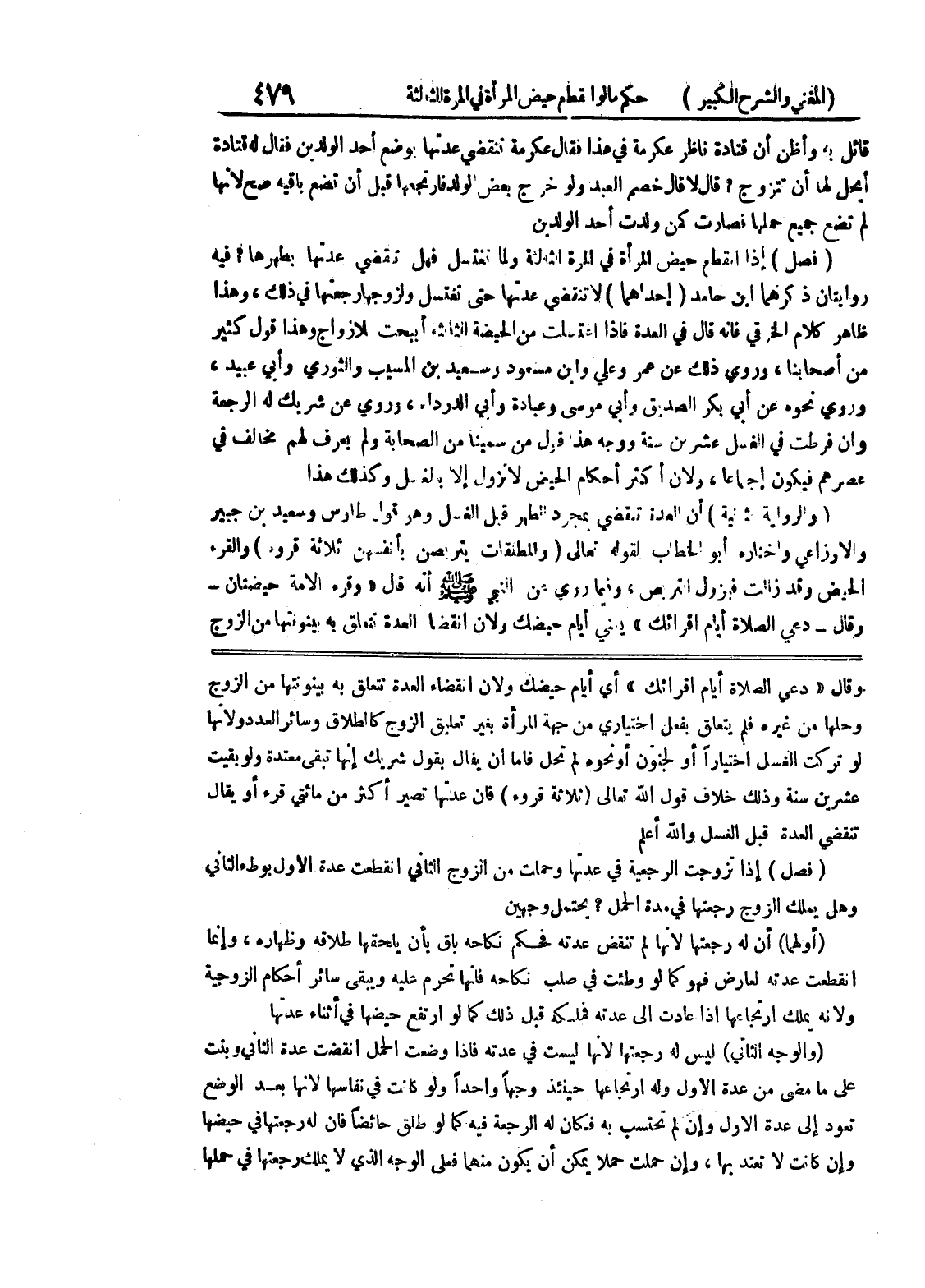 وقال " دعي الصلاة أيام اقرائك " أي أيام حيضك ولأن انقضاء العدة تتعلق به بينونتها من الزوج وحلها من غيره فلم يتعلق بفعل اختياري من جهة المرأة بغير تعليق الزوج كالطلاق وسائر العدد ولأنها لو تركت الغسل اختياراً أو لجنون أو نحوه لم تحل فأما أن يقال بقول شريك إنها تبقى معتدة ولو بقيت عشرين سنة وذلك خلاف قول الله تعالى (ثلاثة قروء) فإن عدتها تصير أكثر من مائتي قرء أو يقال تنقضي العدة قبل الغسل والله أعلم (فصل) إذا تزوجت الرجعية في عدتها وحملت من الزوج الثاني انقطعت عدة الاول بوطئ الثاني وهل يملك الزوج رجعتها في مدة الحمل؟ يحتمل وجهين (أولهما) أن له رجعتها لأنها لم تنقض عدته فحكم نكاحه باق بأن يلحقها طلاقه وظهاره، وإنما انقطعت عدته لعارض فهو كما لو وطئت في صلب نكاحه فإنها تحرم عليه ويبقى سائر أحكام الزوجية ولأنه يملك ارتجاعها إذا عادت إلى عدته فملكه قبل ذلك كما لو ارتفع حيضها في أثناء عدتها (والوجه الثاني) ليس له رجعتها لأنها ليست في عدته فإذا وضعت الحمل انقضت عدة الثاني وبنت على ما مضى من عدة الأول وله ارتجاعها حينئذ وجهاً واحداً ولو كانت في نفاسها لأنها بعد الوضع تعود إلى عدة الأول وإن لم تحتسب به فكان له الرجعة فيه كما لو طلق حائضاً فإن له رجعتها في حيضها وإن كانت لا تعتد بها، وإن حملت حملا يمكن أن يكون منهما فعلى الوجه الذي لا يملك رجعتها في حملها