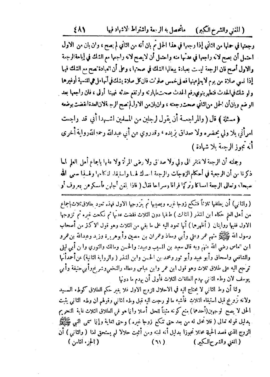 (والثاني) أن يطلقها ثلاثاً فتنكح زوجاً غيره ويصيبها ثم تزوجها الأول فهذه تعود بطلاق ثلاث بإجماع من أهل العلم حكاه ابن المنذر (الثالث) طلقها دون الثلاث فقضت عدتها ثم نكحت غيره ثم تزوجها الأول ففيها روايتان (أظهرهما) أنها تعود إليه على ما بقي من الثلاث وهو قول الأكثر من أصحاب رسول الله صلى الله عليه وسلم منهم عمر وعلي وأبي ومعاذ وعمران بن حصين وأبو هريرة وزيد وعبد الله بن عمرو ابن العاص رضي الله عنهم وبه قال سعيد بن المسيب وعبيدة والحسن ومالك والثوري وابن أبي ليلى والشافعي واسحاق وأبو عبيد وأبو ثور ومحمد بن الحسن وابن المنذر (والرواية الثانية) عن أحمد أنها ترجع إليه عن طلاق ثلاث وهو قول ابن عمر وابن عباس وعطاء والنخعي وشريح وأبي حنيفة وأبي يوسف لان وطئ الثاني يهدم الطلقات الثلاث فأولى أن يهدم ما دونها ولنا أن وط الثاني لا يحتاج إليه في الإحلال للزوج الأول فلا يغير حكم الطلاق كوطئ السيد ولأنه تزويج قبل استيفاء الثلاث فأشبه ما لو رجعت إليه قبل وطئ الثاني وقولهم ان وطئ الثاني يثبت الحل لا يصح لوجهين (أحدهما) منع كونه مثبتا للحل أصلا وإنما هو في الطلاق الثلاث غاية التحريم بدليل قوله تعالى (فلا تحل له من بعد حتى تنكح زوجا غيره) وحتى للغاية وإنما سمى النبي صلى الله عليه وسلم الزوج الذي قصد الحيلة محللاً تجوزاً بدليل أنه لبنه ومن أثبت حلالاً لم يستحق لعنا (والثاني) أن