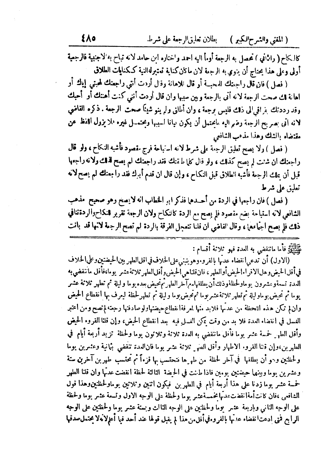 صلى الله عليه وسلم فأما ما تنقضي به العدة فهو ثلاثة أقسام: (الأول) أن تدعي انقضاء عدتها بالقروء وهو ينبني على الخلاف في أقل الطهر بين الحيضتين وعلى الخلاف في أقل الحيض وهل الاقراء الحيض أو الطهر، فإن قلنا هي الحيض وأقل الطهر ثلاثة عشر يوماً، فأقل ما تنقضي به العدة تسعة وعشرون يوماً ولحظة وذلك أن يطلقها مع آخر الطهر ثم تحيض بعده يوماً وليلة ثم تطهر ثلاثة عشر يوماً ثم تحيض يوماً وليلة ثم تطهر ثلاثة عشر يوماً ثم تحيض يوماً وليلة ثم تطهر لحظة ليعرف بها انقطاع الحيض وإن لم تكن هذه اللحظة من عدتها فلا بد منها لمعرفة انقطاع حيضتها ولو صادفتها رجعته لم تصح ومن اعتبر الغسل في انقضاء العدة فلا بد من وقت يمكن الغسل فيه بعد انقطاع الحيض، وإن قلنا القروء الحيض وأقل الطهر خمسة عشر يوماً فأقل ما تنقضي به العدة ثلاثة وثلاثون يوما لحظة تزيد أربعة أيام في الطهرين، وإن قلنا القروء الاطهار وأقل الطهر ثلاثة عشر يوماً فإن العدة تنقضي بثمانية وعشرين يوماً ولحظتين وهو أن يطلقها في آخر لحظة من طهرها فتحتسب بها قزءا ثم تحتسب طهرين آخرين ستة وعشرين يوماً وبينهما حيضتين يومين فإذا طعنت في الحيضة الثالثة لحظة انقضت عدتها وإن قلنا الطهر خمسة عشر يوماً زدنا على هذا أربعة أيام في الطهرين فيكون اثنين وثلاثين يوما لحظتين وهذا قول الشافعي، فإن كانت أمة انقضت عدتها بخمسة عشر يوماً ولحظة على الوجه الأول وتسعة عشر يوماً ولحظة على الوجه الثاني وباربعة عشر يوماً ولحظتين على الوجه الثالث وبستة عشر يوماً ولحظتين على الوجه الرابع فمتى ادعت انقضاء عدتها بالقروء في أقل من هذا لم يقبل قولها عند أحد فيما أعلم لأنه لا يحتمل صدقها