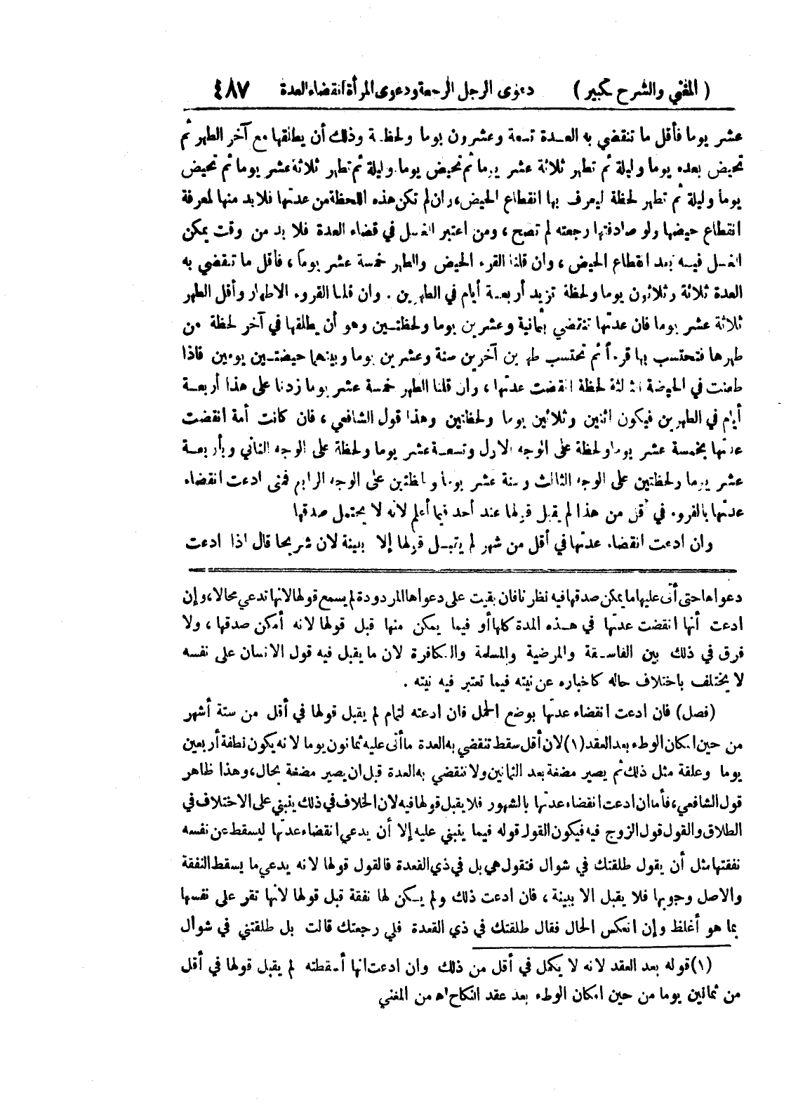 (فصل) فإن ادعت انقضاء عدتها بوضع الحمل فان ادعته لتمام لم يقبل قولها في أقل من ستة أشهر من حين امكان الوطئ بعد العقد (1) لأن أقل سقط تنقضي به العدة ما أتى عليه ثمانون يوماً لأنه يكون نطفة أربعين يوماً وعلقة مثل ذلك ثم يصير مضغة بعد الثمانين ولا تنقضي به العدة قبل أن يصير مضغة بحال، وهذا ظاهر قول الشافعي، فأما إن ادعت انقضاء عدتها بالشهور فلا يقبل قولها فيه لأن الخلاف في ذلك ينبني على الاختلاف في الطلاق والقول قول الزوج فيه فيكون القول قوله فيما ينبني عليه إلا أن يدعي انقضاء عدتها ليسقط عن نفسه نفقتها مثل أن يقول طلقتك في شوال فتقول هي بل في ذي القعدة فالقول قولها لأنه يدعي ما يسقط النفقة والأصل وجوبها فلا يقبل إلا بينة، فإن ادعت ذلك ولم يكن لها نفقة قبل قولها لأنها تقر على نفسها بما هو أغلظ وإن انعكس الحال فقال طلقتك في ذي القعدة فلي رجعتك قالت بل طلقتني في شوال
