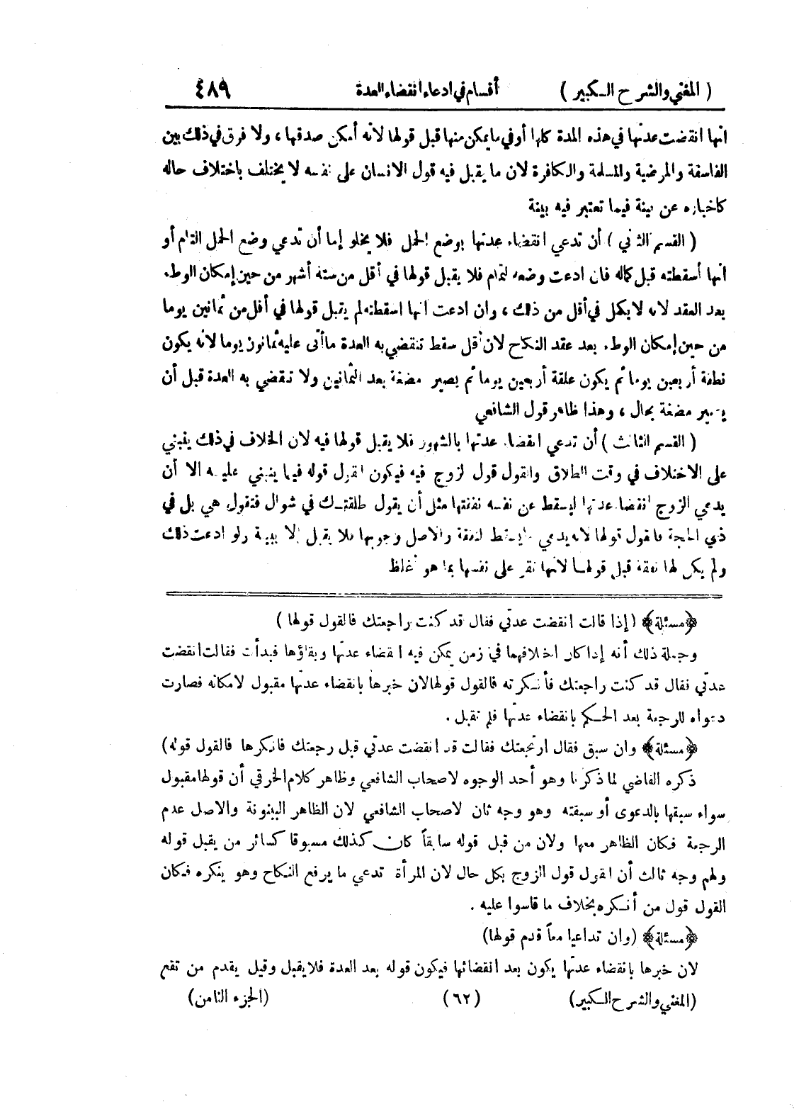 سواء سبقها بالدعوى أو سبقته وهو وجه ثان لأصحاب الشافعي لأن الظاهر البينونة والأصل عدم الرجعة فكان الظاهر معها ولأن من قبل قوله سابقاً كان كذلك مسبوقاً كسائر من يقبل قوله ولهم وجه ثالث أن القول قول الزوج بكل حال لأن المرأة تدعي ما يرفع النكاح وهو ينكره فكان القول قول من أنكره بخلاف ما قاسوا عليه.