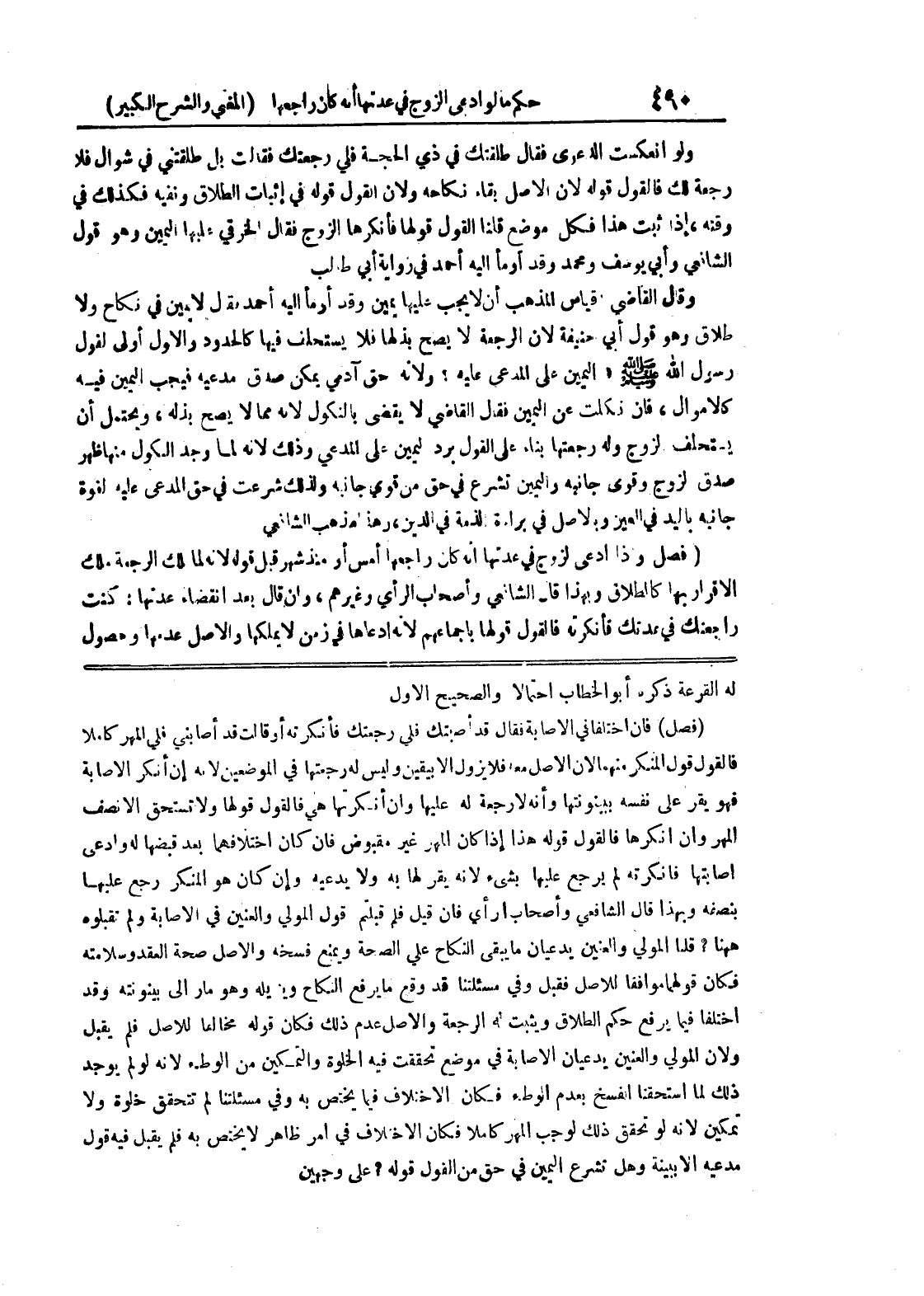 له القرعة ذكره أبو الخطاب احتمالا والصحيح الأول (فصل) فإن اختلفا في الإصابة فقال قد أصبتك فلي رجعتك فأنكرته أو قالت قد أصابني فلي المهر كاملاً فالقول قول المنكر منهما لأن الأصل معه فلا يزول إلا بيقين وليس له رجعتها في الموضعين لأنه إن أنكر الإصابة فهو يقر على نفسه بينونتها وأنه لا رجعة له عليها وإن أنكرتها هي فالقول قولها ولا تستحق إلا نصف المهر وإن انكرها فالقول قوله هذا إذا كان المهر غير مقبوض فإن كان اختلافهما بعد قبضها له وادعى إصابتها فانكرته لم يرجع عليها بشئ لأنه يقر لها به ولا يدعيه وإن كان هو المنكر رجع عليها بنصفه وبهذا قال الشافعي وأصحاب الرأي فإن قيل فلم قبلتم قول المولي والعنين في الإصابة ولم تقبلوه ههنا؟ قلنا المولي والعنين يدعيان ما يبقي النكاح على الصحة ويمنع فسخه والأصل صحة العقد وسلامته فكان قولهما موافقاً للأصل فقبل وفي مسئلتنا قد وقع ما يرفع النكاح ويزيله وهو مار إلى بينونة وقد اختلفا فيما يرفع حكم الطلاق ويثبت له الرجعة والأصل عدم ذلك فكان قوله مخالفاً للأصل فلم يقبل ولأن المولي والعنين يدعيان الاصابة في موضع تحققت فيه الخلوة والتمكين من الوطئ لأنه لو لم يوجد ذلك لما استحقتا الفسخ بعدم الوطئ فكان الاختلاف فيما يختص به وفي مسئلتنا لم تتحقق خلوة ولا تمكين لأنه لو تحقق ذلك لوجب المهر كاملاً فكان الاختلاف في أمر ظاهر لا يختص به فلم يقبل فيه قول مدعيه إلا ببينة وهل تشرع اليمين في حق من القول قوله؟ على وجهين