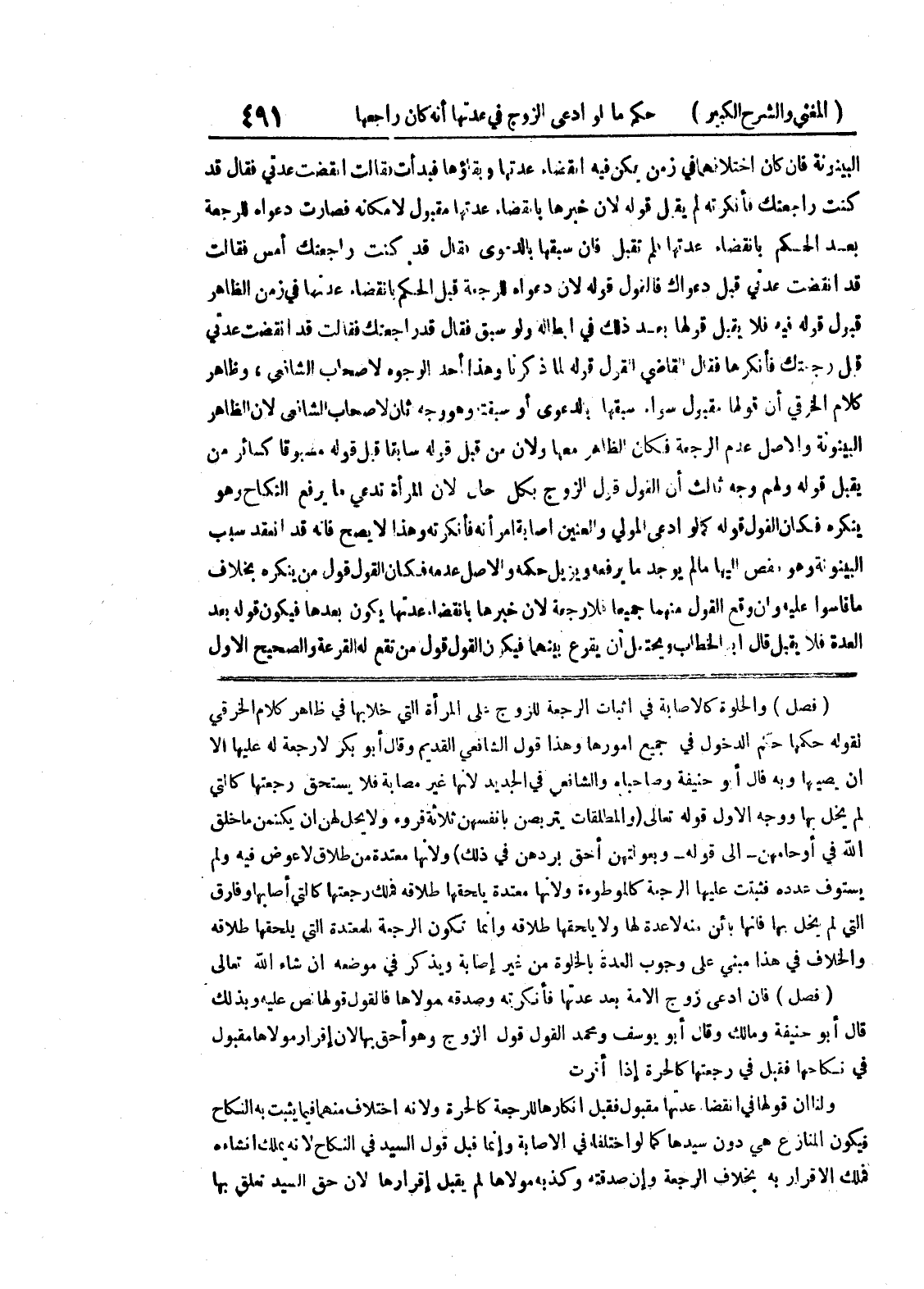 (فصل) والخلوة كالإصابة في إثبات الرجعة للزوج على المرأة التي خلا بها في ظاهر كلام الخرقي لقوله حكمها حكم الدخول في جميع أمورها وهذا قول الشافعي القديم وقال أبو بكر لا رجعة له عليها إلا أن يصيبها وبه قال أبو حنيفة وصاحباه والشافعي في الجديد لأنها غير مصابة فلا يستحق وجعتها كالتي لم يخل بها ووجه الأول قوله تعالى (والمطلقات يتربصن بأنفسهن ثلاثة قروء ولا يحل لهن أن يكتمن ما خلق الله في أوحامهن - إلى قوله - وبعولتهن أحق بردهن في ذلك) ولأنها معتدة من طلاق لا عوض فيه ولم يستوف عدده فثبتت عليها الرجعة كالموطؤة ولأنها معتدة يلحقها طلاقه فملك رجعتها كالتي أصابها وفارق التي لم يخل بها فإنها بائن منه لا عدة لها ولا يلحقها طلاقه وإنما تكون الرجعة تلمعتدة التي يلحقها طلاقه والخلاف في هذا مبني على وجوب العدة بالخلوة من غير إصابة ويذكر في موضعه إن شاء الله تعالى (فصل) فإن ادعى زوج الأمة بعد عدتها فأنكره وصدقه مولاها فالقول قولها نص عليه وبذلك قال أبو حنيفة ومالك وقال أبو يوسف ومحمد القول قول الزوج وهو أحق بها لأن إقرار مولاها مقبول في نكاحها فقبل في رجعتها كالحرة إذا أقرت ولنا أن قولها في انقضاء عدتها مقبول فقبل إنكارها للرجعة كالحرة ولأنه اختلاف منهما فيما يثبت به النكاح فيكون المنازع هي دون سيدها كما لو اختلفا في الإصابة وإنما قبل قول السيد في النكاح لأنه يملك إنشاءه فملك الإقرار به بخلاف الرجعة وإن صدقته وكذبه مولاها لم يقبل إقرارها لأن حق السيد تعلق بها