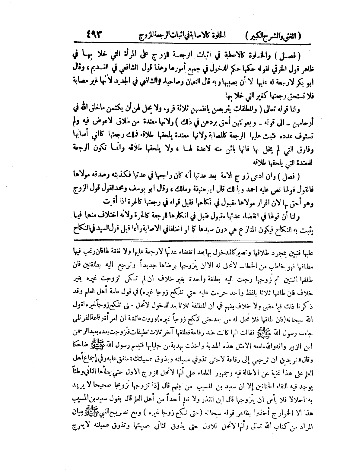 عليها فتبين بمجرد طلاقها وتصير كالمدخول بها بعد انقضاء عدتها لا رجعة عليها ولا نفقة لها فإن رغب فيها مطلقها فهو خاطب من الخطاب لا تحل له إلا أن يتزوجها برضاها جديداً وترجع إليه بطلقتين فإن طلقها اثنتين ثم تزوجها رجعت إليه بطلقة واحدة بغير خلاف إن لم تكن تزوجت غيره بغير خلاف فإن طلقها ثلاثاً بلفظ واحد حرمت عليه حتى تنكح زوجا غيره) في قول عامة أهل العلم وقد ذكرنا ذلك فيما مضى ولا خلاف بينهم في أن المطلقة ثلاثاً بعد الدخول لا تحل حتى تنكح زوجا غيره لقول الله سبحانه (فإن طلقها فلا تحل له من بعد حتى تنكح زوجا غيره) وروت عائشة أن امرأة رفاعة القرظي جاءت رسول الله صلى الله عليه وسلم فقالت إنها كانت عند رفاعة فطلقها آخر ثلاث تطيقات فتزوجت بعده بعبد الرحمن ابن الزبير وإنه والله ما معه إلا مثل هذه الهدبة وأخذت بهدبة من جلبابها فتبسم رسول الله صلى الله عليه وسلم ضحاكا وقال " تريدين أن ترجعي إلى رفاعة لا حتى تذوقي عسيلته ويذوق عسيلتك " متفق عليه وفي إجماع أهل العلم على هذا غنية عن الإطالة فيه وجمهور العلماء على أنها لا تحل للزوج الأول حتى يطأها الثاني وطئاً يوجد فيه التقاء الختانين إلا أن سعيد بن المسيب من بينهم قال إذا تزوجها تزويجاً صحيحاً لا يريد به اخلالا فلا بأس أن يتزوجها قال إبن المنذر ولا نعلم احدا من أهل العلم قال بقول سعيد بن المسيب هذا إلا الخوارج أخذوا بظاهر قوله سبحانه (حتى تنكح زوجا غيره) ومع تصريح النبي صلى الله عليه وسلم ببيان المراد من كتاب الله تعالى وأنها لا تحل للاول حتى يذوق الثاني عسيلتها وتذوق عسيلته لا يعرج