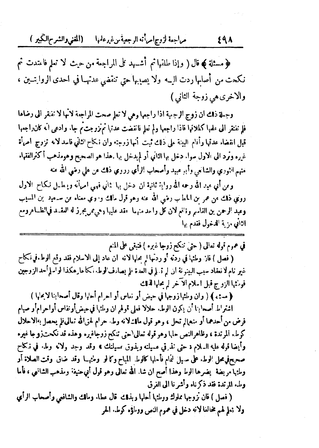 * (مسألة) * (وإن وطئها زوجها في حيض أو نفاس أو إحرام أحلها وقال أصحابنا لا يحلها) اشتراط أصحابنا أن يكون الوطئ حلالاً فعلي قولهم إن وطئها في حيض أو نفاس أو إحرام أو صيام فرض من أحدهما أو منهما لم تحل، وهو قول مالك لانه وطئ حرام لحق الله تعالى فلم يحصل به الإحلال كوطئ المرتدة، وظاهر النص حلها وهو قوله تعالى (حتى تنكح زوجا غيره وهذه قد نكحت زوجاً غيره) وأيضاً قوله عليه السلام " حتى تذرقي عسيلته ويذوق عسيلتك " وقد وجد ولأنه وطئ في نكاح صحيح في محل الوطئ على سبيل التمام فأحلها كالوطئ المباح وكما لو وطئها وقد ضاق وقت الصلاة أو وطئها مريضة يضرها الوطئ وهذا أصح إن شاء الله تعالى وهو قول أبي حنيفة ومذهب الشافعي، فأما وطئ المرتدة فقد ذكرناه وأشرنا إلى الفرق (فصل) فإن تزوجها مملوك ووطئها أحلها وبذلك قال عطاء ومالك والشافعي وأصحاب الرأي ولا نعلم لهم مخالفاً لأنه دخل في عموم النص ووطؤه كوطئ الحر