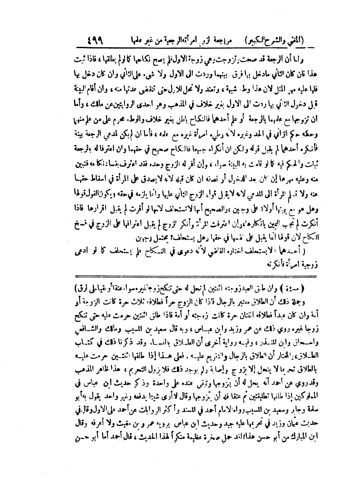 فعلى هذا إذا طلقها اثنتين حرمت عليه بالطلاق تحريماً لا ينحل إلا بزوج واصابة ولم يوجد ذلك فلا يزول التحريم، هذا ظاهر المذهب وقد روي عن أحمد أنه يحل له أن يتزوجها وتبقى عنده على واحدة وذكر حديث ابن عباس في المملوكين إذا طلقها تطليقتين ثم عتقا فله أن يتزوجها وقال لا أرى شيئاً يدفعه وغير واحد يقول به أبو سلمة وجابر وسعيد بن المسيب رواه الإمام أحمد في المسند وأكثر الروايات عن أحمد على الأول وقال في حديث عثمان وزيد في تحريمها عليه جيد وحديث ابن عباس يرويه عمرو بن مغيث ولا أعرفه وقال