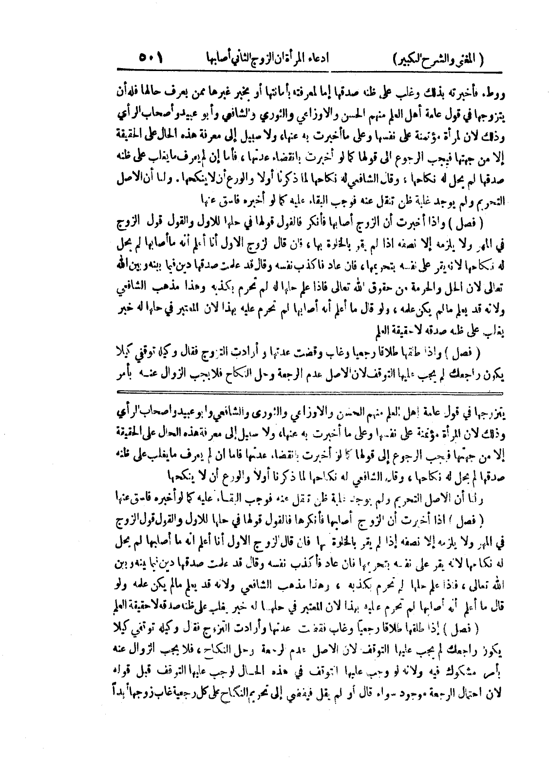 له نكاحها لأنه يقر على نفسه بتحريمها فإن عاد فأكذب نفسه وقال قد علمت صدقها دين فيما بينه وبين الله تعالى، فإذا علم حلها لم تحرم بكذبه، وهذا مذهب الشافعي ولأنه قد يعلم ما لم يكن علمه ولو قال ما أعلم أنه أصابها لم تحرم عليه بهذا لأن المعتبر في حلها له خبر يغلب على ظنه صدقه لا حقيقة العلم (فصل) إذا طلقها طلاقاً رجعياً وغاب فقضت عدتها وأرادت التزوج فقال وكيله توقفي كيلا يكون راجعك لم يجب عليها التوقف لأن الأصل عدم الرجعة وحل النكاح، فلا يجب الزوال عنه بأمر مشكوك فيه ولأنه لو وجب عليها التوقف في هذه الحال لوجب عليها التوقف قبل قوله لأن احتمال الرجعة موجود سواء قال أو لم يقل فيفضي إلى تحريم النكاح على كل رجعية غاب زوجها أبداً