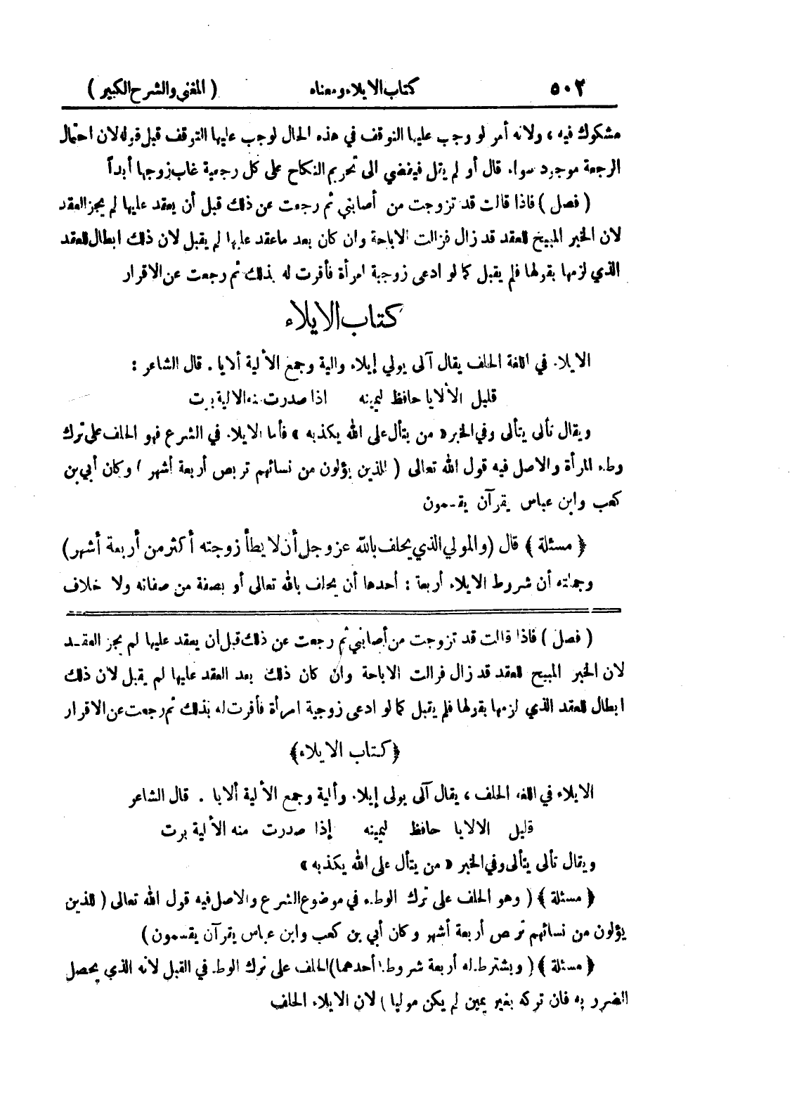 قال الشاعر قليل الالايا حافظ ليمينه إذا صدرت منه الألية برت ويقال تألى يتألى وفي الخبر " من يتأل على الله يكذبه " * (مسألة) * (وهو الحلف على ترك الوطئ في موضع الشرع والأصل فيه قول الله تعالى (للذين يؤلون من نسائهم تربص أربعة أشهر وكان أبي بن كعب وابن عباس يقرآن يقسمون) * (مسألة) * (ويشترط له أربعة شروط أحدهما) الحلف على ترك الوطئ في القبل لأنه الذي يحصل الضرر به فان تركه بغير يمين لم يكن موليا) لأن الإيلاء الحلف