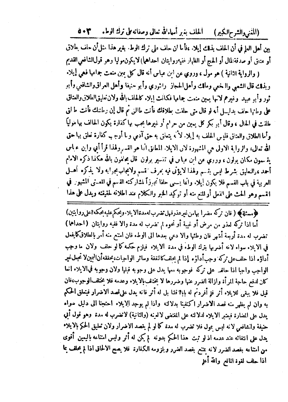 * (مسألة) * (فإن تركه مضراً بها من غير عذر فهل تضرب له مدة الإيلاء ويحكم عليه بحكمه؟ على روايتين) أما إذا تركه لعذر من مرض أو غيبة أو نحوه لم تضرب له مدة وإلا ففيه روايتان (إحداهما)