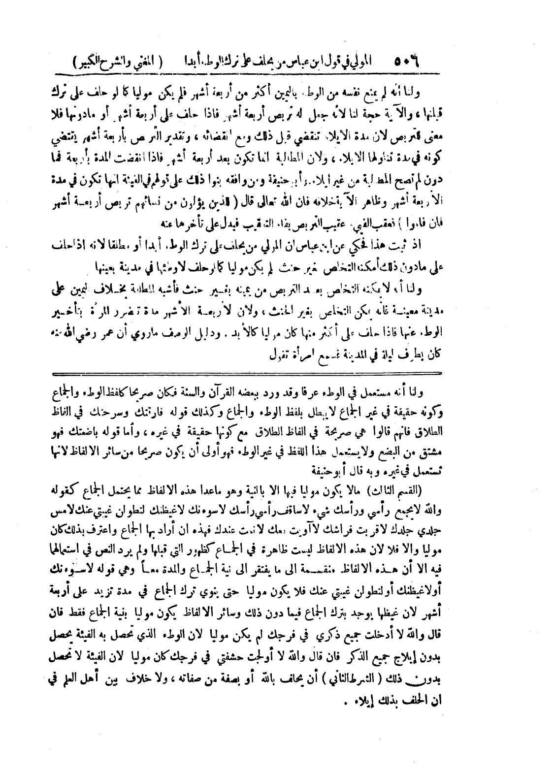 تستعمل في غيره وبه قال أبو حنيفة (القسم الثالث) ما لا يكون موليا فيها إلا بالنية وهو ما عدا هذه الألفاظ مما يحتمل الجماع كقوله والله لا يجمع رأسي ورأسك شئ لا ساقف رأسي رأسك لا سوءنك لا غيظتك لتطولن غيبتي عنك لا مس جلدي جلدك لا قربت فراشك لا أويت معك لا نمت عندك فهذه إن أراد بها الجماع واعترف بذلك كان موليا وإلا فلا لأن هذه الألفاظ ليست ظاهرة في الجماع كظهور التي قبلها ولم يرد النص في استعمالهما فيه الا إن هذه الألفاظ منقسمة إلى ما يفتقر إلى نية الجماع والمدة معاً وهي قوله لا سوءنك أو لا غيظنك أو لتطولن غيبتي عنك فلا يكون موليا حتى ينوي ترك الجماع في مدة تزيد على أربعة أشهر لأن غيظها يوجد بترك الجماع فيما دون ذلك وسائر الألفاظ يكون موليا بنية الجماع فقط فإن قال والله لا أدخلت جميع ذكري في فرجك لم يكن موليا لأن الوطئ الذي تحصل به الفيئة يحصل بدون إيلاج جميع الذكر فإن قال والله لا أولجت حشفتي في فرجك كان كان موليا لأن الفيئة لا تحصل بدون ذلك (الشرط الثاني) أن يحلف بالله أو بصفة من صفاته، ولا خلاف بين أهل العلم في أن الحلف بذلك إيلاء.