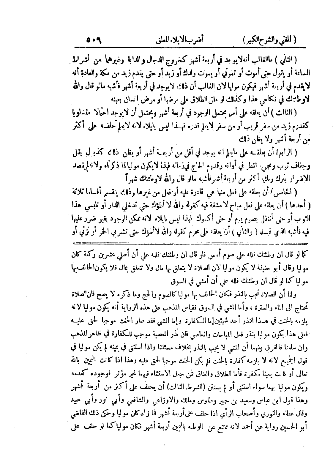 موليا كما لو قال إن وطئتك فلله علي أن أمشي في السوق ولنا أن الصلاة تجب بالنذر فكان الحالف بها موليا كالصوم والحج وما ذكره لا يصح فإن الصلاة تحتاج إلى الماء والسترة، وأما المشي في السوق فقياس المذهب على هذه الرواية أنه يكون موليا لأنه يلزمه بالحنث في هذا النذر أحد شيئين إما الكفارة وإما المشي فقد صار الحنث موجباً لحق عليه فعلى هذا يكون موليا بنذر فعل المباحات والمعاصي فإن نذر المعصية موجب للكفارة في ظاهر المذهب وإن سلمنا فالفرق بينهما أن المشي لا يجب بالنذر بخلاف مسئلتنا وإذا استثنى في يمينه لم يكن موليا في قول الجميع لأنه لا يلزمه كفارة بالحنث فلم يكن الحنث موجباً لحق عليه وهذا إذا كانت اليمين بالله تعالى أو كانت يمينا مكفرة فأما الطلاق والعتاق فمن جعل الاستثناء فيهما غير مؤثر فوجوده كعدمه ويكون موليا بهما سواء استثنى أو لم يستثن (الشرط الثالث) أن يحلف على أكثر من أربعة أشهر وهذا قول ابن عباس وسعيد بن جبير وطاوس ومالك والاوزاعي والشافعي وأبي ثور وأبي عبيد وقال عطاء والثوري وأصحاب الرأي إذا حلف على أربعة أشهر فما زاد كان موليا وحكى ذلك القاضي أبو الحسين رواية عن أحمد لأنه ممتنع عن الوطئ باليمين أربعة أشهر فكان موليا كما لو حلف على