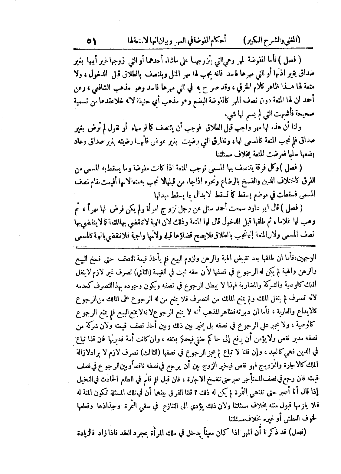 الوجهين، فأما إن طلقها بعد تقبيض الهبة والرهن ولزوم البيع فلم يأخذ قيمة النصف حتى فسخ البيع والرهن والهبة لم يكن له الرجوع في نصفها لأن حقه ثبت في القيمة (الثاني) تصرف غير لازم لا ينقل الملك كالوصية والشركة والمضاربة فهذا لا يبطل الرجوع في نصفه ويكون وجوده بهذا التصرف كعدمه لأنه تصرف لم ينقل الملك ولم يمنع المالك من التصرف فلا يمنع من له الرجوع على المالك من الرجوع كالإيداع والعارية، فأما إن دبرته فظاهر المذهب أنه لا يمنع الرجوع لأنه لا يمنع البيع فلم يمنع الرجوع كالوصية، ولا يجبر على الرجوع في نصفه بل يخير بين ذلك وبين أخذ نصف قيمته ولان شركة من نصفه مدبر نقص ولا يؤمن أن يرفع الى حاكم حنفي فيحكم بعتقه، وإن كانت أمة فدبرتها فإن قلنا تباع في الدين فهي كالعبد، وإن قلنا لا تباع لم يجز الرجوع في نصفها (الثالث) تصرف لازم لا يراد لازالة الملك كالإجارة والتزويج فهو نقص فيخير الزوج بين أن يرجع في نصفه ناقصاً وبين الرجوع في نصف قيمته فإن رجع في نصف المستأجر صبر حتى تنفسخ الإجارة، فإن قيل فلم قلتم في الطلع الحادث في النخيل إذا قال أنا أصبر حتى تنتهي الثمرة لم يكن له ذلك؟ قلنا الفرق بينهما أن في تلك المسألة تكون المنة له فلا يلزمها قبول منته بخلاف مسئلتنا ولان ذلك يؤدي إلى التنازع في سقي الثمرة وجذاذها وقطعها لخوف العطش أو غيره بخلاف مسئلتنا