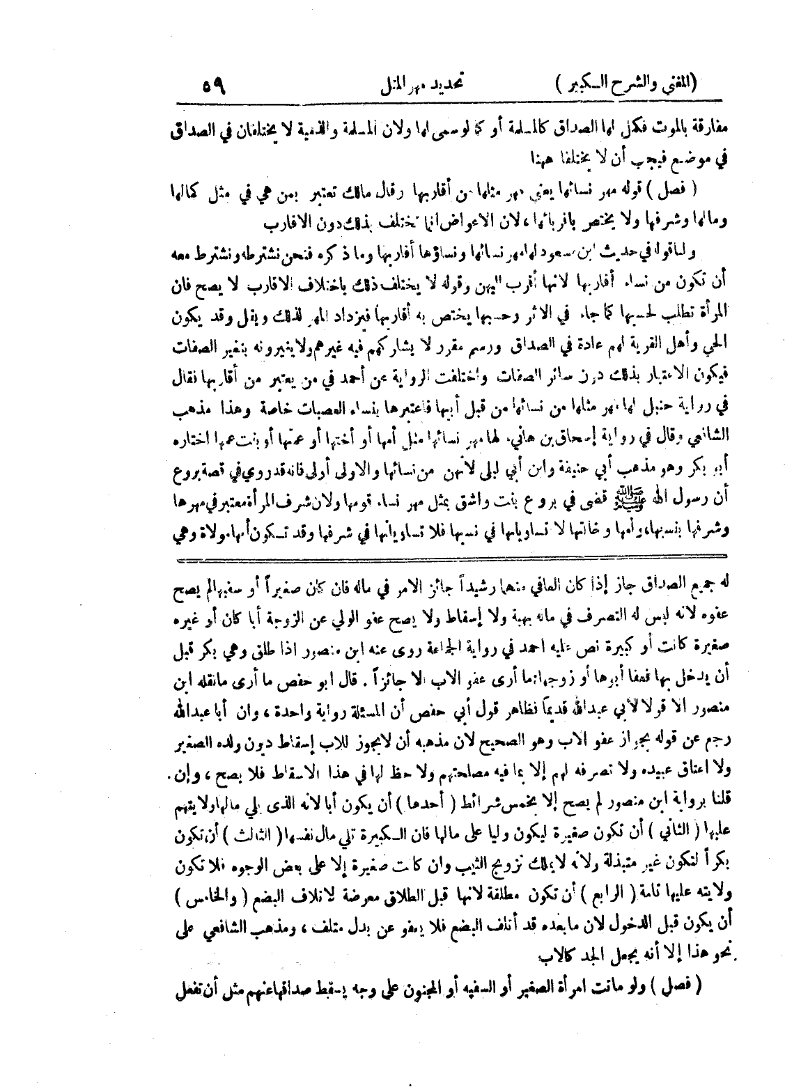 منصور إلا قولاً لأبي عبد الله قديماً فظاهر قول أبي حفص أن المسألة رواية واحدة، وان أبا عبد الله رجع عن قوله بجواز عفو الأب وهو الصحيح لأن مذهبه أن لا يجوز للأب إسقاط ديون ولده الصغير ولا إعتاق عبيده ولا تصرفه لهم إلا بما فيه مصلحتهم ولا حظ لها في هذا الإسقاط فلا يصح، وإن قلنا برواية ابن منصور لم يصح إلا بخمس شرائط (أحدها) أن يكون أباً لأنه الذي يلي مالها ولا يتهم عليها (الثاني) ان تكون صغيرة ليكون ولياً على مالها فإن الكبيرة تلي مال نفسها (الثالث) أن تكون بكراً لتكون غير متبذلة ولأنه لا يملك تزويج الثيب وإن كانت صغيرة إلا على بعض الوجوه فلا تكون ولايته عليه تامة (الرابع) أن تكون مطلقة لأنها قبل الطلاق معرضة لاتلاف البضع (والخامس) أن يكون قبل الدخول لأن ما بعده قد أتلف البضع فلا يعفو عن بدل متلف، ومذهب الشافعي على نحو هذا إلا أنه يجعل الجد كالأب (فصل) ولو ماتت امرأة الصغير أو السفيه أو المجنون على وجه يسقط صداقها عنهم مثل أن تفعل