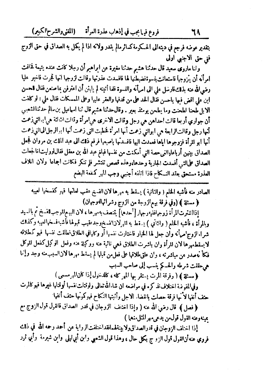 الصادر منه فأشبه الخلع (والثانية) يسقط به مهرها لأن الفسخ عقب لعانها فهو كفسخها لعيبه * (مسألة) * (وفي فرقة بيع الزوجة من الزوج وشرائها له وجهان) إذا اشترت المرأة زوجها ففيه وجهان [أحدهما] يتنصف به مهرها، لأن البيع الموجب للفسخ تم بالسيد وبالمرأة، فأشبه الخلع (والثاني) يسقط به المهر لأن الفسخ وجد عقيب قبولها فأشبه فسخها لعيبه وكذلك شراء الزوج امرأته وإن جعل لها الخيار فاختارت نفسها أو وكلها في الطلاق فطلقت نفسها فهو كطلاقه لا يسقط مهرها لأن المرأة وإن باشرت الطلاق فهي نائبة عنه ووكيلة عنه وفعل الوكيل كفعل الموكل
