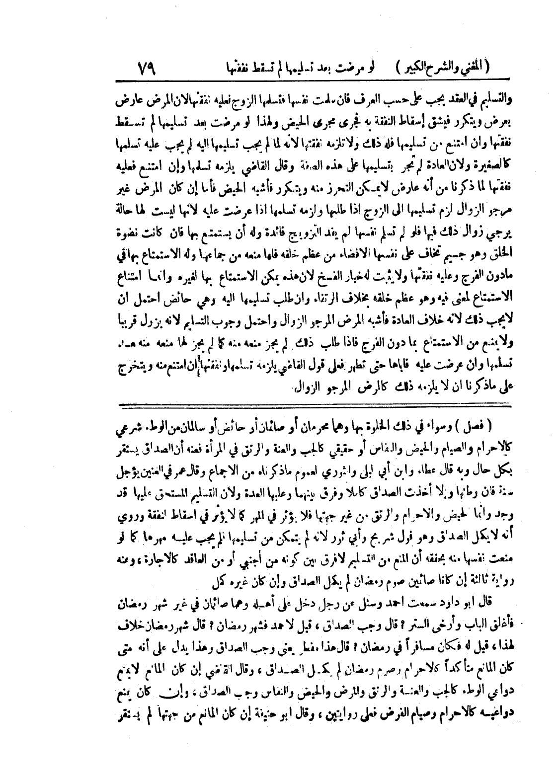 (فصل) وسواء في ذلك الخلوة بها وهما محرمان أو صائمان أو حائض أو سالمان من الوطئ شرعي كالإحرام والصيام والحيض والنفاس أو حقيقي كالجب والعنة والرتق في المرأة فعنه أن الصداق يستقر بكل حال وبه قال عطاء وابن أبي ليلى والثوري لعموم ما ذكرناه من الإجماع وقال عمر في العنين يؤجل سنة فإن وطئها وإلا أخذت الصداق كاملاً وفرق بينهما وعليها العدة ولأن التسليم المستحق عليها قد وجد وإنما الحيض والاحرام والرتق من غير جهتها فلا يؤثر في المهر كما لا يؤثر في اسقاط النفقة وروي أنه لا يكمل الصداق وهو قول شريج وأبي ثور لأنه لم يتمكن من تسليمها فلم يجب عليه مهرها كما لو منعت نفسها منه يحققه أن المنع من التسليم لا فرق بين كونه من أجنبي أو من العاقد كالإجارة، وعنه رواية ثالثة إن كانا صائمين صوم رمضان لم يكمل الصداق وإن كان غيره كمل قال أبو داود سمعت أحمد وسئل عن رجل دخل على أهله وهما صائمان في غير شهر رمضان فأغلق الباب وأرخى الستر؟ قال وجب الصداق، قيل لاحمد فشهر رمضان؟ قال شهر رمضان خلاف لهذا، قيل له فكان مسافراً في رمضان؟ قال هذا مفطر يعني وجب الصداق وهذا يدل على أنه متى كان المانع متأكداً كالإحرام وصوم رمضان لم يكمل الصداق، وقال القاضي إن كان المانع لا يمنع دواعي الوطئ كالجب والعنة والرتق والمرض والحيض والنفاس وجب الصداق، وإن كان يمنع دواعية كالإحرام وصيام الفرض فعلى روايتين، وقال أبو حنيفة إن كان المانع من جهتها لم يستقر