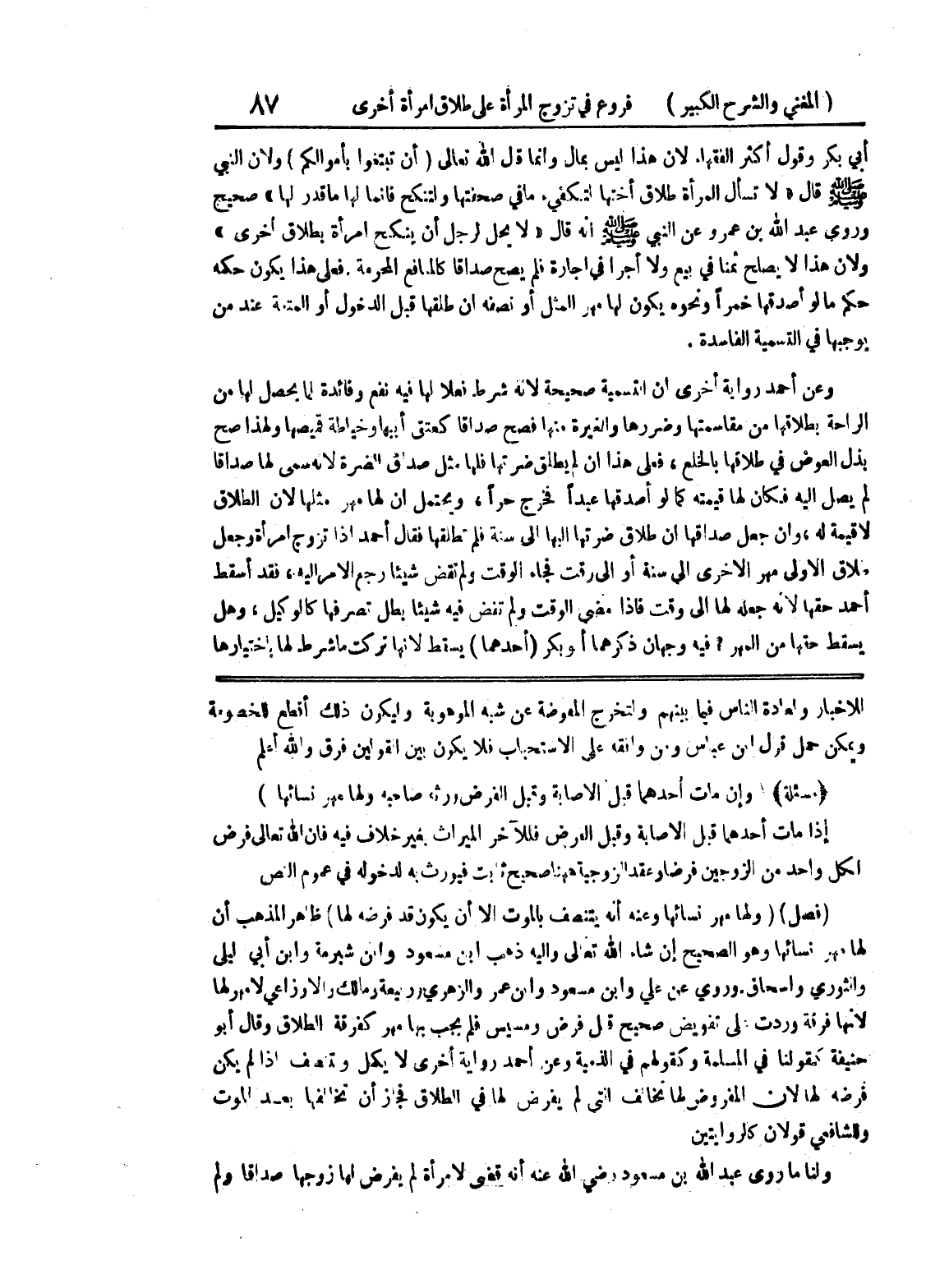 للأخبار ولعادة الناس فيما بينهم ولتخرج المفوضة عن شبه الموهوبة وليكون ذلك أقطع للخصومة ويمكن حمل قول ابن عباس ومن وافقه على الاستحباب فلا يكون بين القولين فرق والله أعلم * (مسألة) * (وإن مات أحدهما قبل الإصابة وقبل الفرض ورثه صاحبه ولها مهر نسائها) إذا مات أحدهما قبل الإصابة وقبل الفرض فللآخر الميراث بغير خلاف فيه فإن الله تعالى فرض لكل واحد من الزوجين فرضا وعقد الزوجية ههنا صحيح ثابت فيورث به لدخوله في عموم النص (فصل) (ولها مهر نسائها وعنه أنه يتنصف بالموت إلا أن يكون قد فرضه لها) ظاهر المذهب أن لها مهر نسائها وهو الصحيح إن شاء الله تعالى وإليه ذهب ابن مسعود ابن شبرمة وابن أبي ليلى والثوري واسحاق.