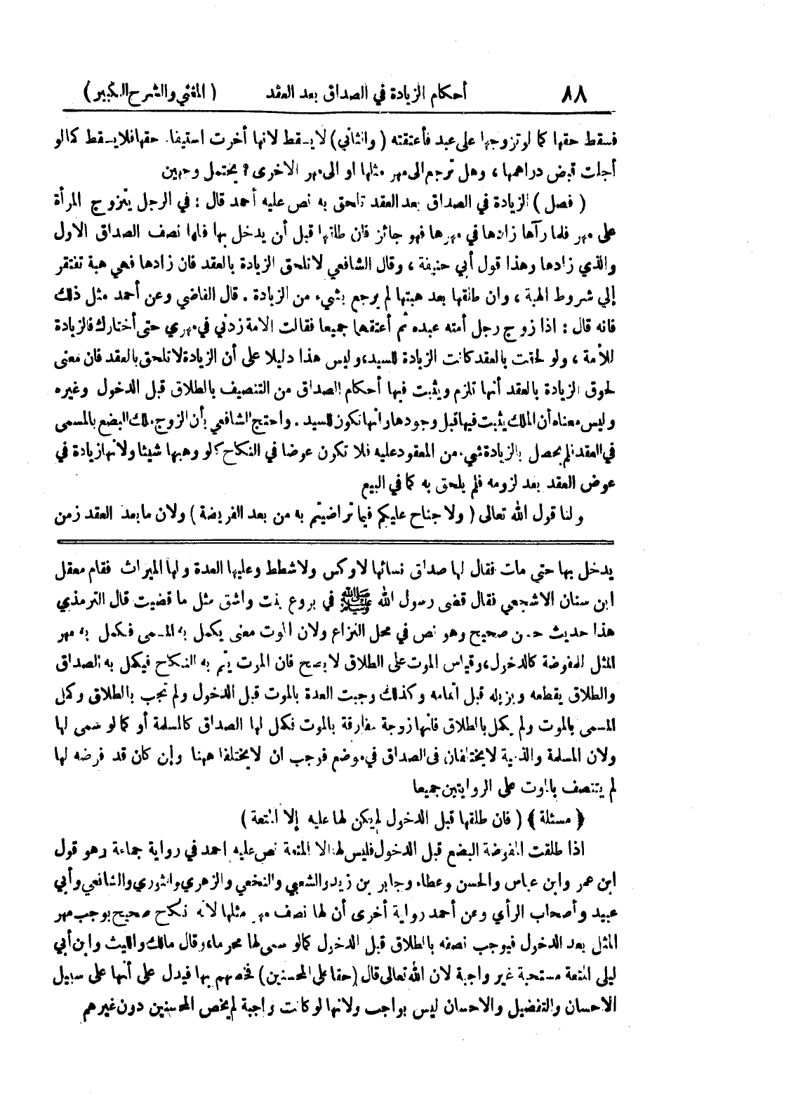 يدخل بها حتى مات فقال لها صداق نسائها لا وكس ولا شطط وعليها العدة ولها الميراث فقام معقل ابن سنان الأشجعي فقال قضى رسول الله صلى الله عليه وسلم في بروع بنت واشق مثل ما قضيت قال الترمذي هذا حديث حسن صحيح وهو نص في محل النزاع ولأن الموت معنى يكمل به المسمى فكمل به مهر المثل للمفوضة كالدخول، وقياس الموت على الطلاق لا يصح فإن الموت يتم به النكاح فيكمل به الصداق والطلاق يقطعه ويزيله قبل إتمامه وكذلك وجبت العدة بالموت قبل الدخول ولم تجب بالطلاق وكمل المسمى بالموت ولم يكمل بالطلاق فإنها زوجة مفارقة بالموت فكمل لها الصداق كالمسلمة أو كما لو سمى لها ولأن المسلمة والذمية لا يختلفان في الصداق في موضع فوجب أن لا يختلفا ههنا وإن كان قد فرضه لها لم يتنصف بالموت على الروايتين جميعاً * (مسألة) * (فإن طلقها قبل الدخول لم يكن لها عليه إلا المتعة) إذا طلقت المفوضة البضع قبل الدخول فليس لها إلا المتعة نص عليه أحمد في رواية جماعة وهو قول ابن عمر وابن عباس والحسن وعطاء وجابر بن زيد والشعبي والنخعي والزهري والثوري والشافعي وأبي عبيد وأصحاب الرأي وعن أحمد رواية أخرى أن لها نصف مهر مثلها لأنه نكاح صحيح يوجب مهر المثل بعد الدخول فيجوب نصفه بالطلاق قبل الدخول كما لو سمى لها محرما، وقال مالك والليث وابن أبي ليلى المتعة مستحبة غير واجبة لأن الله تعالى قال (حقا على المحسنين) فخصهم بها فيدل على أنها على سبيل الاحسان والتفضيل والإحسان ليس بواجب ولأنها لو كانت واجبة لم يخص المحسنين دون غيرهم