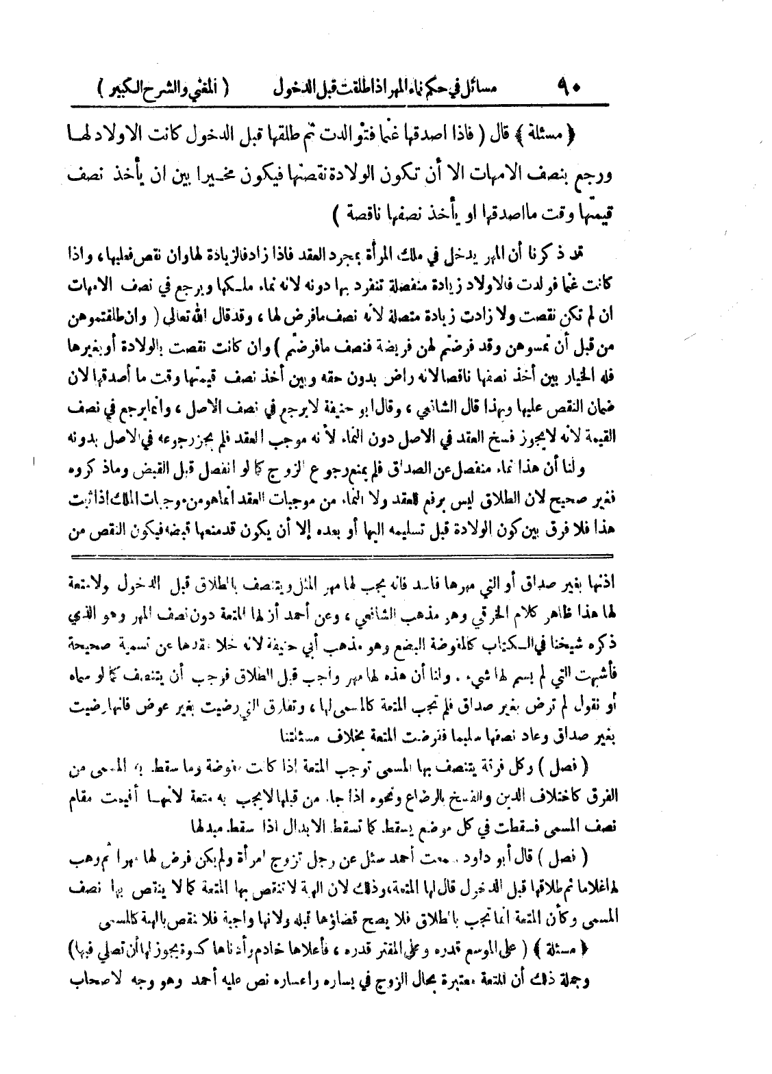 نصف المسمى فسقطت في كل موضع يسقط كما تسقط الابدال إذا سقط مبدلها (فصل) قال أبو داود سمعت أحمد سئل عن رجل تزوج امرأة ولم يكن فرض لها مهراً ثم وهب لها غلاماً ثم طلاقها قبل الدخول قال لها المتعة، وذلك لأن الهبة لا تنقص بها المتعة كما لا ينقص بها نصف المسمى وكان المتعة وانما تجب بالطلاق فلا يصح قضاؤها قبله ولأنها واجبة فلا نقص بالهبة كالمسمى * (مسالة) * (على الموسع قدره وعلى المقتر قدره، فأعلاها خادم وأدناها كسوة يجوز لها أن تصلي فيها) وجملة ذلك أن المتعة معتبرة بحال الزوج في يساره وإعساره نص عليه أحمد وهو وجه الاصحاب
