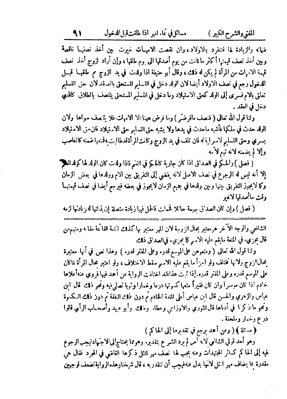 الشافعي والوجه الآخر هو معتبر بحال الزوجة لأن المهر معتبر بها كذلك؟؟؟؟؟ القائمة مقامه ومنهم من قال يجزئ في المتعة ما يقع عليه الاسم كما يجزئ في الصداق ذلك ولنا قول الله تعالى (ومتعوهن على الموسع قدره وعلى المقتر قدره) وهذا نص في أنها معتبرة بحال الزوج ولأنها تختلف ولو أجزأ ما يقع عليه الاسم سقط الاختلاف، ولو اعتبر بحال المرأة لما كان على الموسع قدره وعلى المقتر قدره.