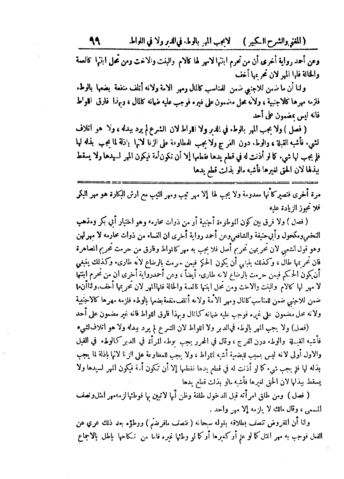ولنا أن ما ضمن للأجنبي ضمن للمناسب كالمال ومهر الامة ولانه أتلف منفعة بضعها بالوطئ فلزمه مهرها كالاجنبية ولأنه محل مضمون على غيره فوجب عليه ضمانه كالمال وبهذا فارق اللواط فإنه غير مضمون على أحد (فصل) ولا يجب المهر بالوطئ في الدبر ولا اللواط لأن الشرع لم يرد ببدله ولا هو إتلاف لشئ فأشبه القبلة والوطئ دون الفرج، وقال في المحرر يجب بوطئ المرأة في الدبر كالوطئ في القبل والأول أولى لأنه ليس بسبب للبضعية أشبه اللواط، ولا يجب للمطاوعة على الزنا لأنها باذلة لما يجب