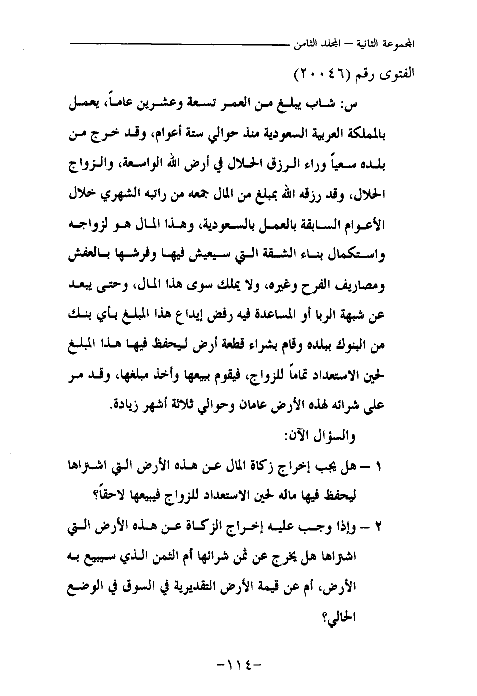 س: شاب يبلغ من العمر تسعة وعشرين عاما، يعمل بالمملكة العربية السعودية منذ حوالي ستة أعوام، وقد خرج من بلده سعيا وراء الرزق الحلال في أرض الله الواسعة، والزواج الحلال، وقد رزقه الله بمبلغ من المال جمعه من راتبه الشهري خلال الأعوام السابقة بالعمل بالسعودية، وهذا المال هو لزواجه واستكمال بناء الشقة التي سيعيش فيها وفرشها بالعفش ومصاريف الفرح وغيره، ولا يملك سوى هذا المال، وحتى يبعد عن شبهة الربا أو المساعدة فيه رفض إيداع هذا المبلغ بأي بنك من البنوك ببلده وقام بشراء قطعة أرض ليحفظ فيها هذا المبلغ لحين الاستعداد تماما للزواج، فيقوم ببيعها وأخذ مبلغها، وقد مر على شرائه لهذه الأرض عامان وحوالي ثلاثة أشهر زيادة.