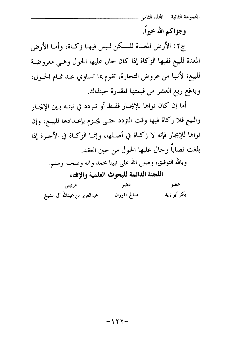ج2: الأرض المعدة للسكن ليس فيها زكاة، وأما الأرض المعدة للبيع ففيها الزكاة إذا كان حال عليها الحول وهي معروضة للبيع؛ لأنها من عروض التجارة، تقوم بما تساوي عند تمام الحول، ويدفع ربع العشر من قيمتها المقدرة حينذاك.