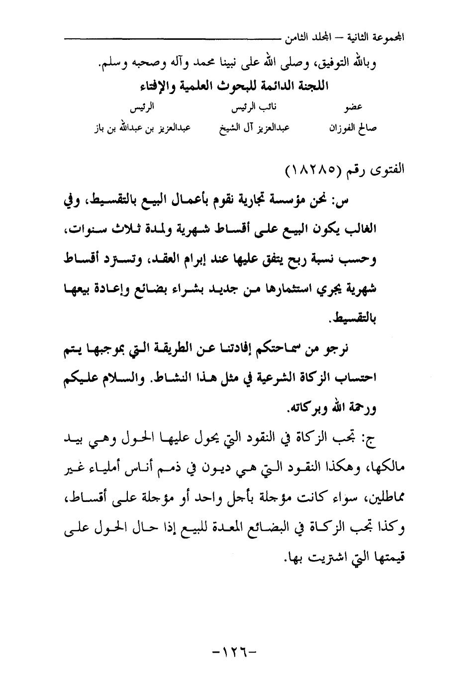 س: نحن مؤسسة تجارية نقوم بأعمال البيع بالتقسيط، وفي الغالب يكون البيع على أقساط شهرية ولمدة ثلاث سنوات، وحسب نسبة ربح يتفق عليها عند إبرام العقد، وتسترد أقساط شهرية يجري استثمارها من جديد بشراء بضائع وإعادة بيعها بالتقسيط.