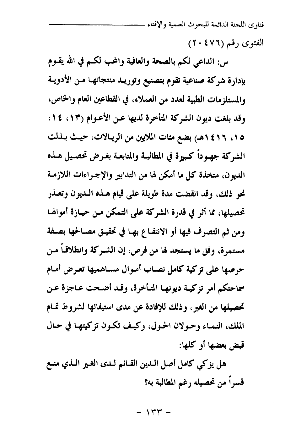 س: الداعي لكم بالصحة والعافية والمحب لكم في الله يقوم بإدارة شركة صناعية تقوم بتصنيع وتوريد منتجاتها من الأدوية والمستلزمات الطبية لعدد من العملاء، في القطاعين العام والخاص، وقد بلغت ديون الشركة المتأخرة لديها عن الأعوام (13، 14، 15، 1416هـ) بضع مئات الملايين من الريالات، حيث بذلت الشركة جهودا كبيرة في المطالبة والمتابعة بغرض تحصيل هذه الديون، متخذة كل ما أمكن لها من التدابير والإجراءات اللازمة نحو ذلك، وقد انقضت مدة طويلة على قيام هذه الديون وتعذر تحصيلها، مما أثر في قدرة الشركة على التمكن من حيازة أموالها ومن ثم التصرف فيها أو الانتفاع بها في تحقيق مصالحها بصفة مستمرة، وفق ما يستجد لها من فرص، إن الشركة وانطلاقا من حرصها على تزكية كامل نصاب أموال مساهميها تعرض أمام سماحتكم أمر تزكية ديونها المتأخرة، وقد أضحت عاجزة عن تحصيلها من الغير، وذلك للإفادة عن مدى استيفائها لشروط تمام الملك، النماء وحولان الحول، وكيف تكون تزكيتها في حال قبض بعضها أو كلها: