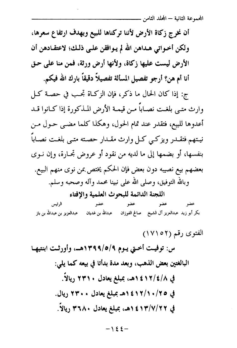 ج: إذا كان الحال ما ذكر، فإن الزكاة تجب في حصة كل وارث متى بلغت نصابا من قيمة الأرض المذكورة إذا كانوا قد أعدوها للبيع، فتقدر عند تمام الحول، وهكذا كلما مضى حول من نيتهم فتقدر ويزكي كل وارث مقدار حصته متى بلغت نصابا بنفسها، أو بضمها إلى ما لديه من نقود أو عروض تجارة، وإن نوى بعضهم بيع نصيبه دون بعض فإن الحكم يختص بمن نوى منهم البيع.