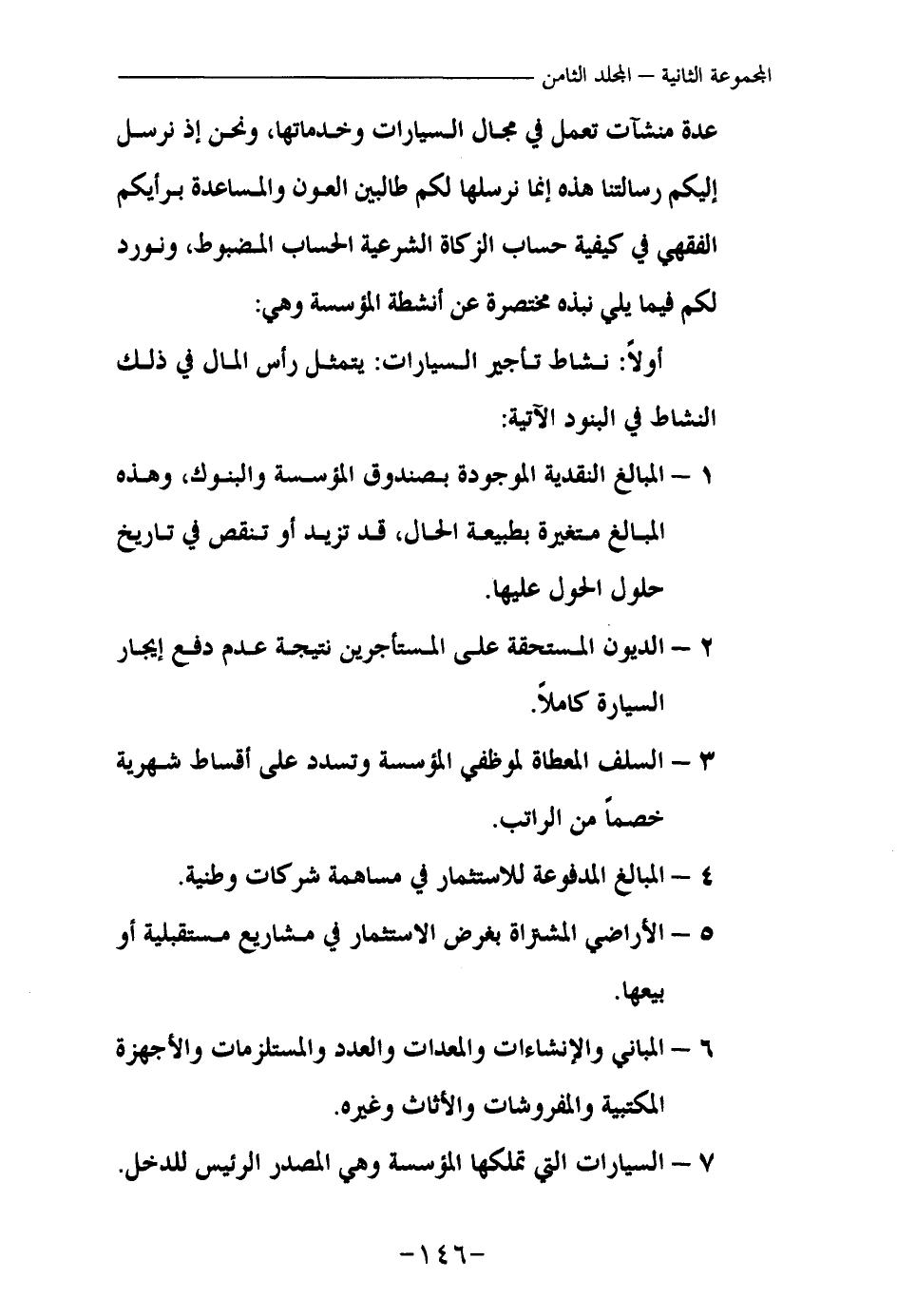 عدة منشآت تعمل في مجال السيارات وخدماتها، ونحن إذ نرسل إليكم رسالتنا هذه إنما نرسلها لكم طالبين العون والمساعدة برأيكم الفقهي في كيفية حساب الزكاة الشرعية الحساب المضبوط، ونورد لكم فيما يلي نبذة مختصرة عن أنشطة المؤسسة وهي: