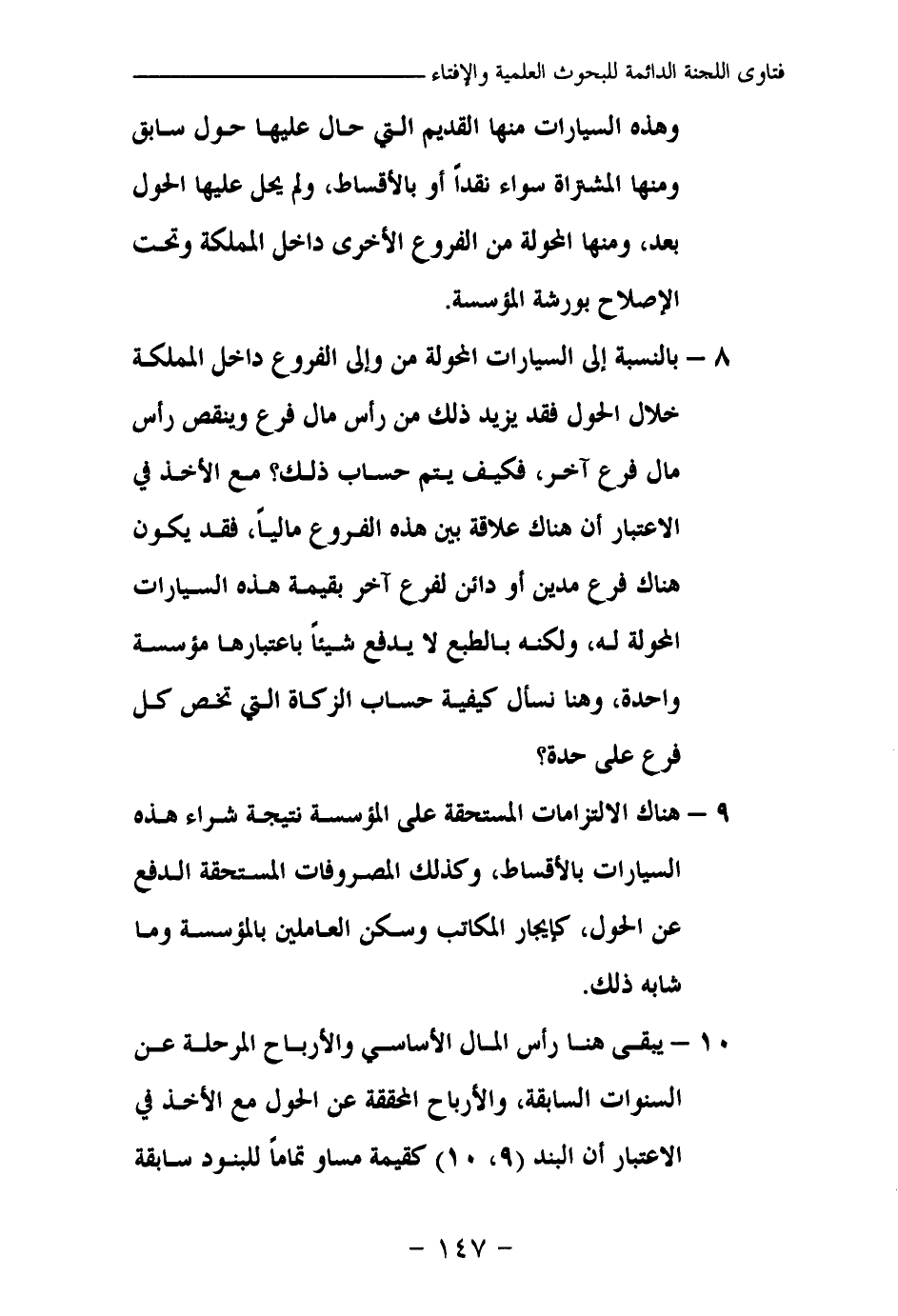 8- بالنسبة إلى السيارات المحولة من وإلى الفروع داخل المملكة خلال الحول فقد يزيد ذلك من رأس مال فرع وينقص رأس مال فرع آخر، فكيف يتم حساب ذلك؟ مع الأخذ في الاعتبار أن هناك علاقة بين هذه الفروع ماليا، فقد يكون هناك فرع مدين أو دائن لفرع آخر بقيمة هذه السيارات المحولة له، ولكنه بالطبع لا يدفع شيئا باعتبارها مؤسسة واحدة، وهنا نسأل كيفية حساب الزكاة التي تخص كل فرع على حدة؟